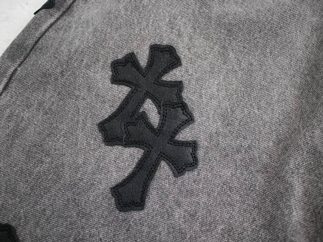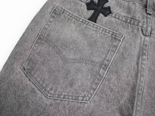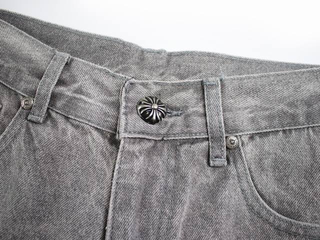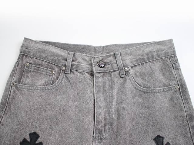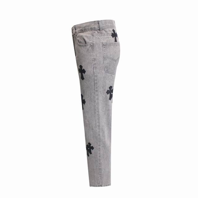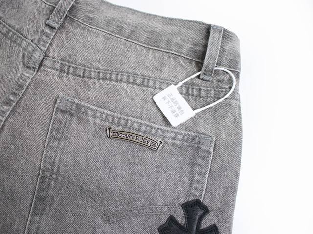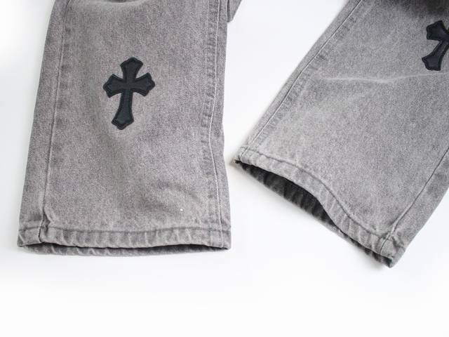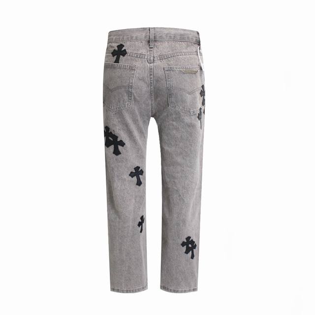 High-end Chrome Hearts leather label cross washed distressed jeans, unisex. All Ch jeans need to be washed as finished products, then disassembled and hand-sewn with sheepskin cross leather before being stitched together. The whole process is too complicated to describe. The texture is felt in the hand, and it looks good. The most amazing pants in Chrome Hearts