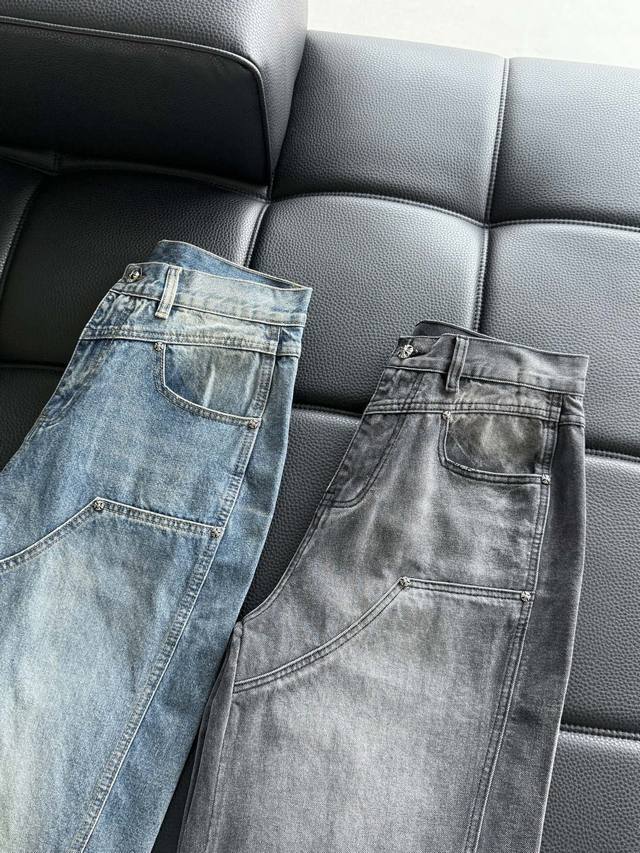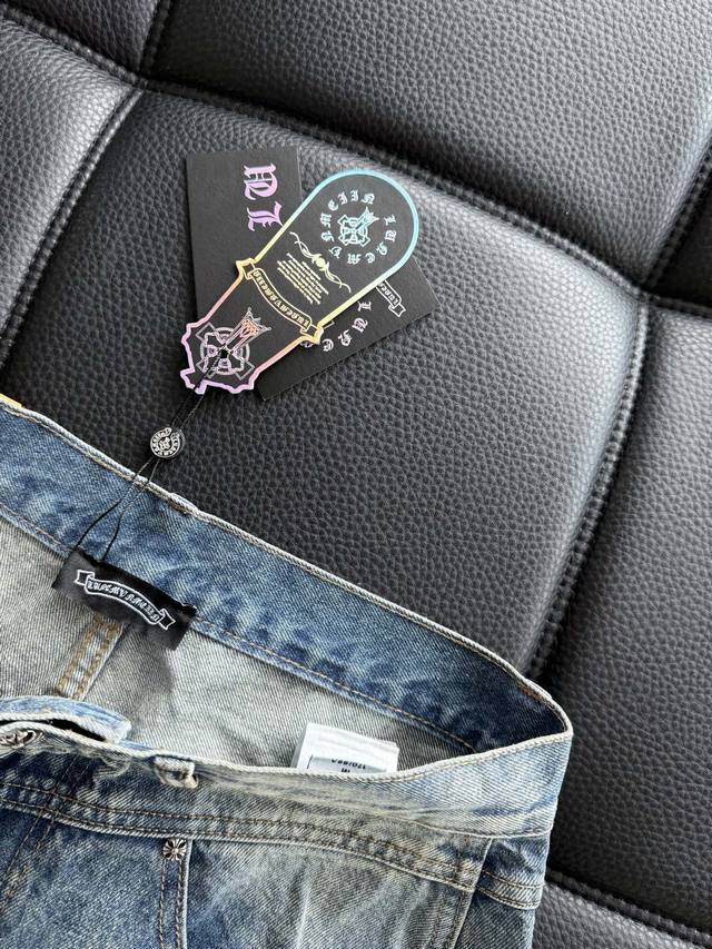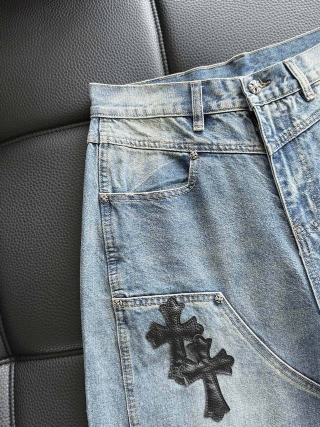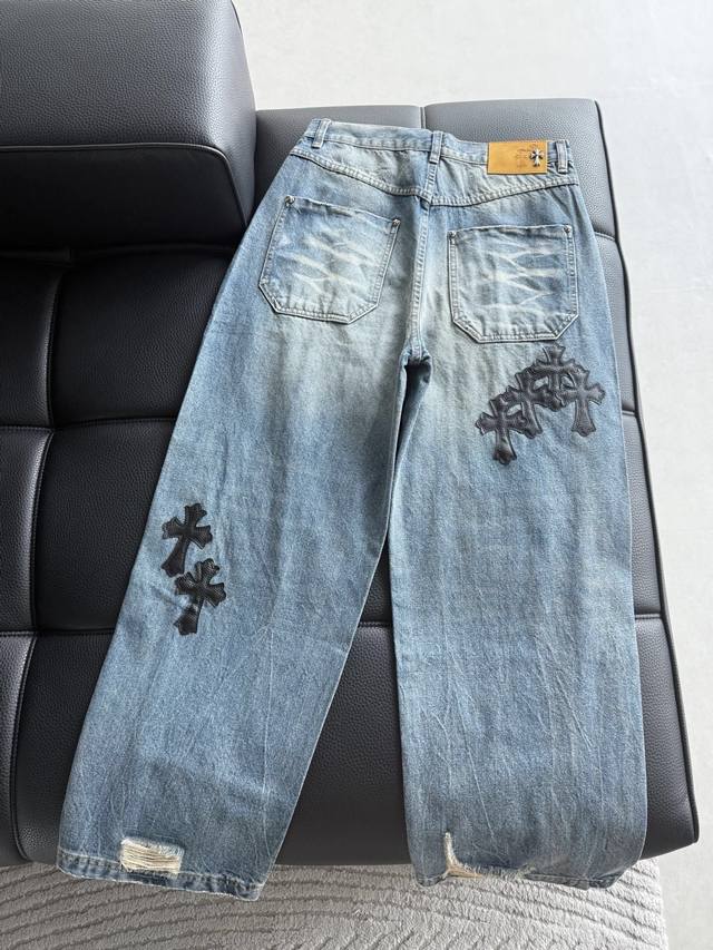 High-end custom-made pure cotton denim trousers with leather patchwork and cross pattern, washed and distressed, hand-distressed for a comfortable feel and top-notch texture. The fabric's texture is very clear and has a very high-quality feel! Highly practical, with minimal embellishments, it exudes a cool and stylish vibe. Effortlessly create a fashionable look! The leather patch technique distinguishes it from printed versions on the market. The Chrome Hearts buttons are individually molded, making them exquisite and eye-catching! Simple, stylish, and understatedly luxurious! Colors: Black, Blue Sizes: S~3X Style Number: 3757