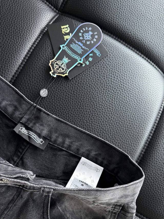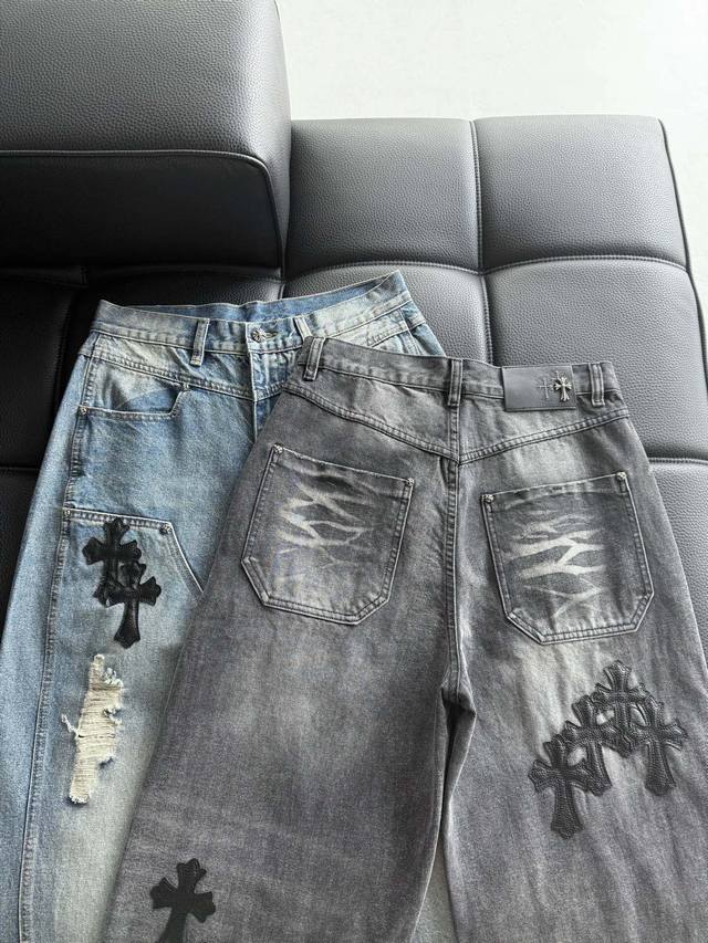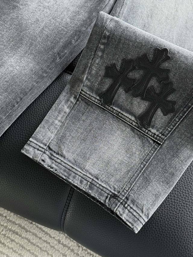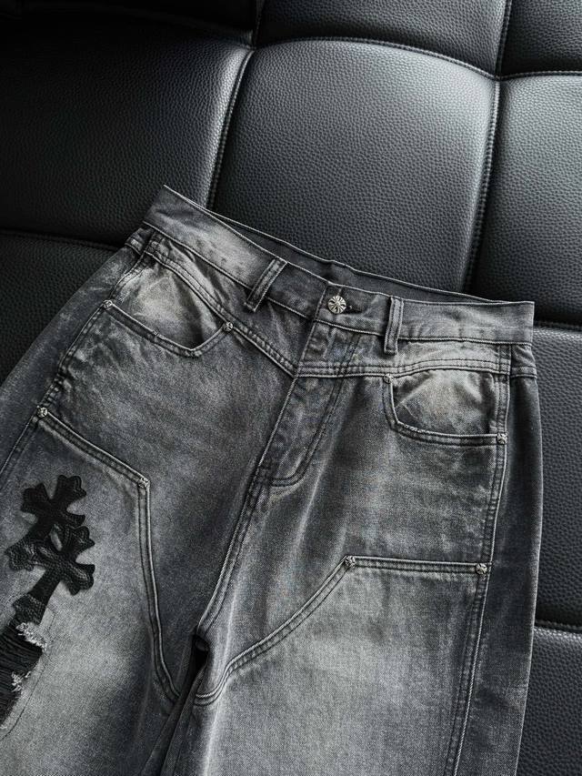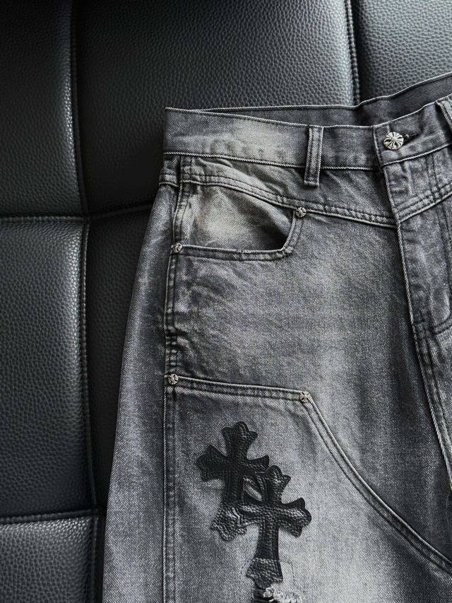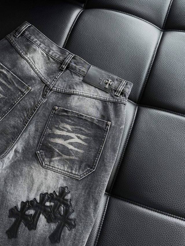 High-end custom-made pure cotton denim trousers with leather patchwork and cross pattern, washed and distressed, hand-distressed for a comfortable feel and top-notch texture. The fabric's texture is very clear and has a very high-quality feel! Highly practical , with minimal embellishments, it exudes a cool and stylish vibe. Effortlessly create a fashionable look! The leather patch technique distinguishes it from printed versions on the market. The Chrome Hearts buttons are individually molded, making them exquisite and eye-catching! Simple, stylish, and understatedly luxurious! Colors: Black, Blue Sizes: S~3X Style Number: 3757