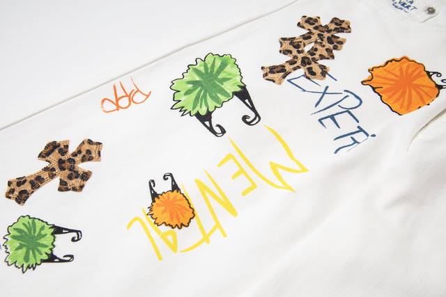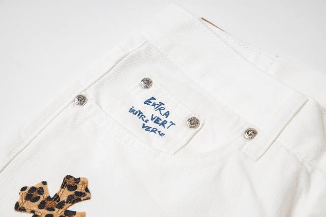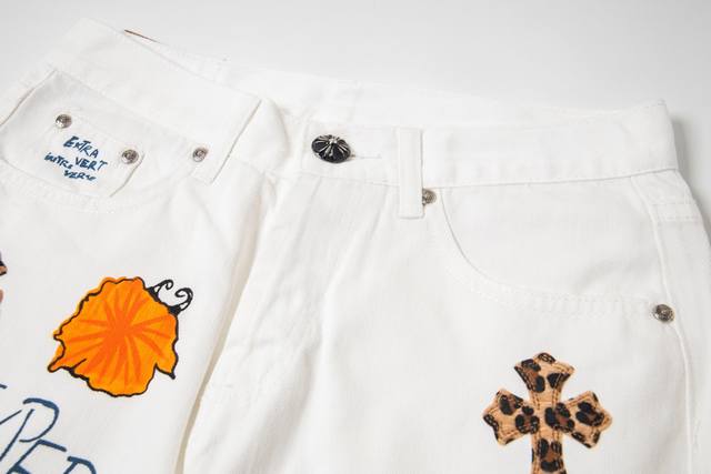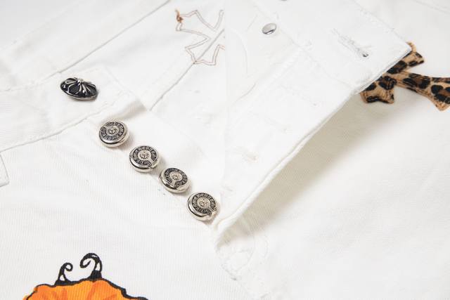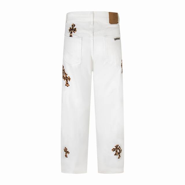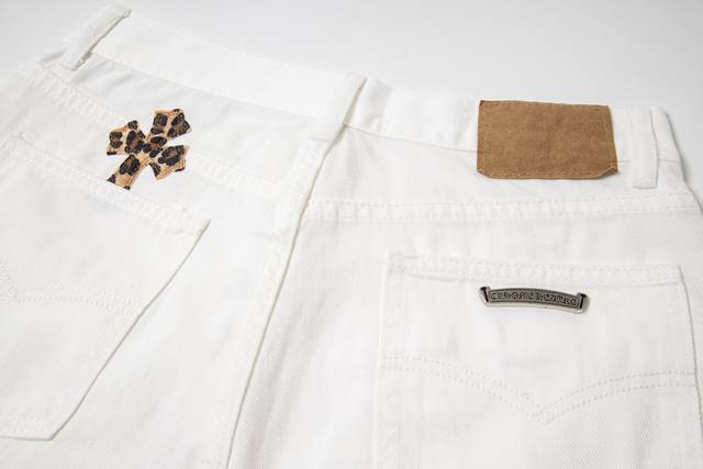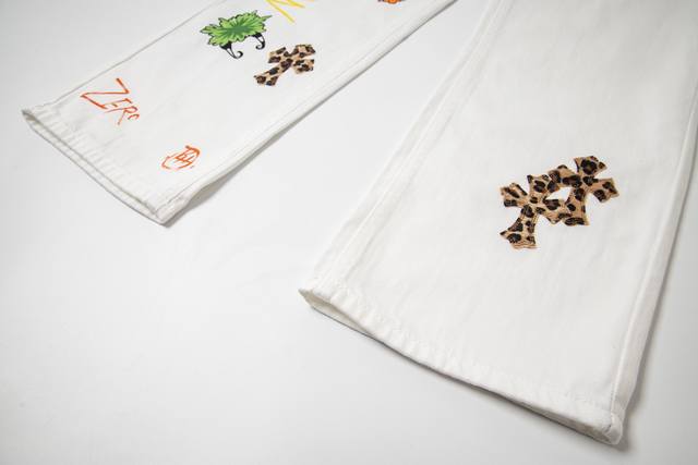 High-quality Chrome Hearts Mattyboy graffiti-painted leopard print cross-over jeans, unisex. These white leopard print Chrome Hearts jeans are a stylish and unique trendy item, cleverly combining white denim with leopard print elements. Some styles also feature patchwork leather and Chrome Hearts signature elements like crosses, showcasing a gothic street style. The hand-painted graffiti and white are a perfect match. Custom graffiti adds a strong street vibe. The heavy-duty hand-painted graffiti craftsmanship ensures a great fit. The front and back crosses and heavy-duty logo details add a touch of sophistication. Sizes: 28-30-32-34