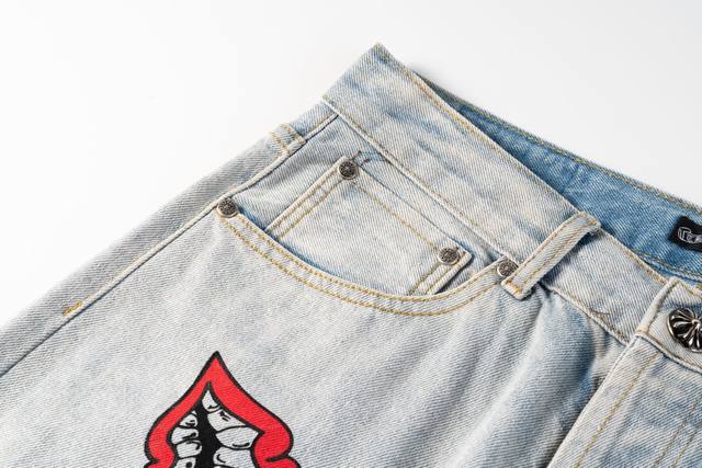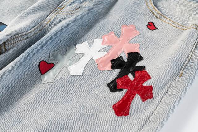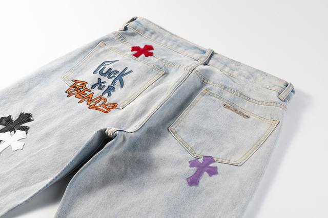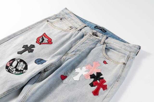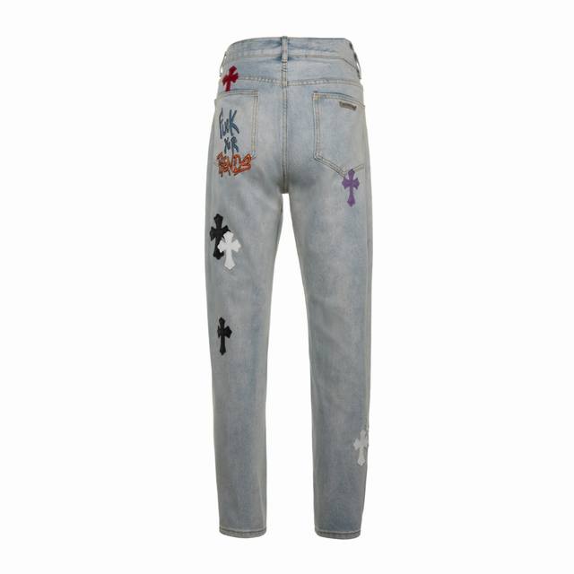 High-quality Chrome Hearts quirky graffiti washed distressed jeans, unisex. Authentic vintage feel with premium Italian cowhide print, recut custom-made sheepskin, three-layer coarse-knit patchwork, and heavy-duty washing and dyeing processes. The heavy washing enhances the fabric's texture, creating a crisp silhouette! The overall three-dimensional cut is absolutely stunning! Custom-made hardware (ZP). A unique design with meticulous details, simple yet elegant, exquisite workmanship, neat stitching, and attention to detail! A gender-neutral, trendy style that's easy for both men and women to wear! Sizes: 30-32-34-36