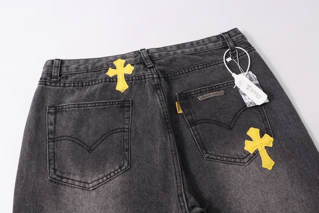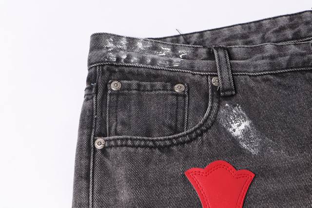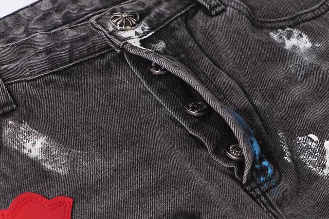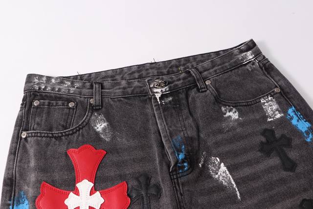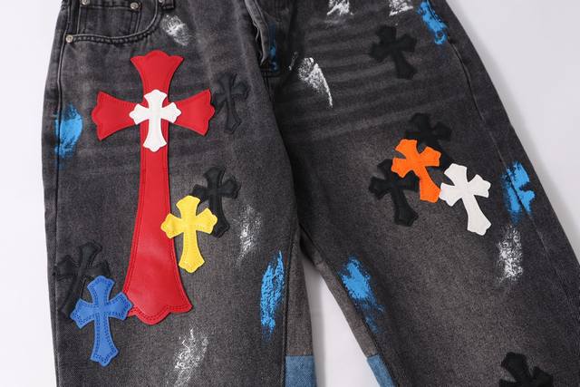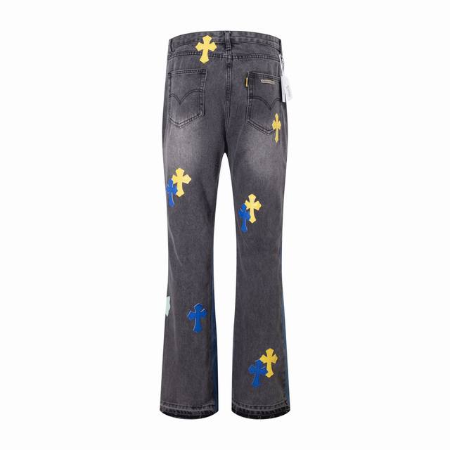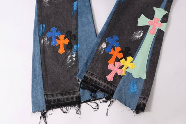 High-quality Chrome Hearts x Gallery Dept. collaboration graffiti-print cross-strap flared jeans, unisex. Authentic vintage feel with premium Italian cowhide print, recut custom-made sheepskin, three-layer coarse-stitched leather patchwork, and heavy-duty washing and dyeing processes. The heavy washing enhances the fabric's texture, creating a crisp silhouette! The overall three-dimensional cut is absolutely stunning! Custom-made hardware (ZP). A unique design with meticulous details, simple yet elegant, exquisite workmanship, neat stitching, and attention to detail! A gender-neutral, trendy style that's easy for both men and women to wear! Sizes: 30-32-34-36
