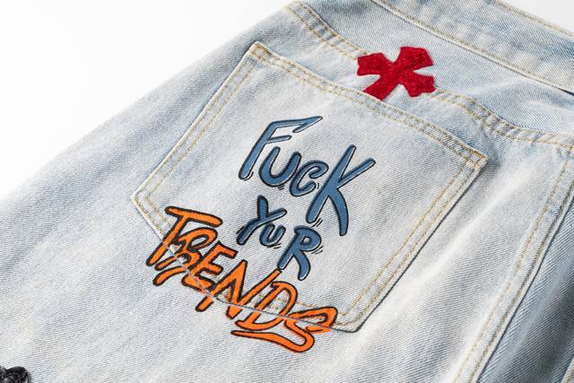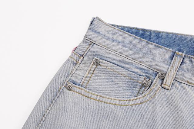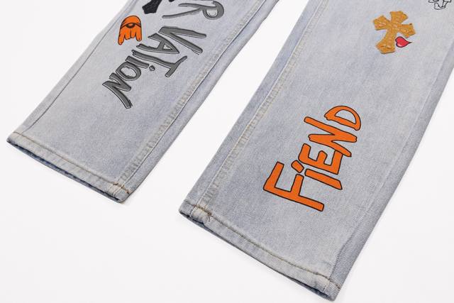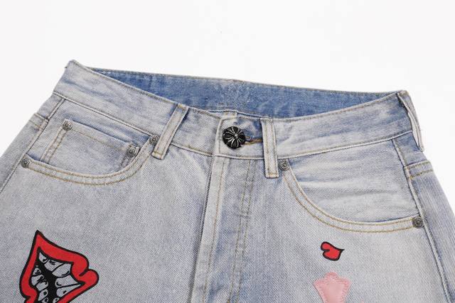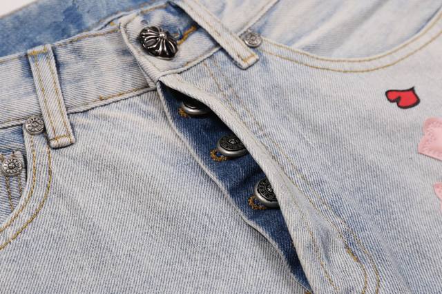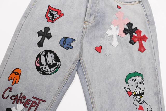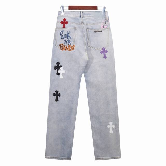 High-version Chrome Hearts quirky graffiti washed distressed jeans, unisex. Authentic vintage feel with premium Italian cowhide print, recut custom-made sheepskin, three-layer coarse-knit patchwork, and heavy-duty washing and dyeing process. The heavy washing enhances the fabric's texture, creating a crisp silhouette! The overall three-dimensional cut is absolutely superb! Custom-made hardware (ZP). A unique design with meticulous details, simple and elegant, exquisite workmanship, neat stitching, and attention to detail! A gender-neutral, trendy style that's easy for both men and women to wear! Sizes: 30-32-34-36