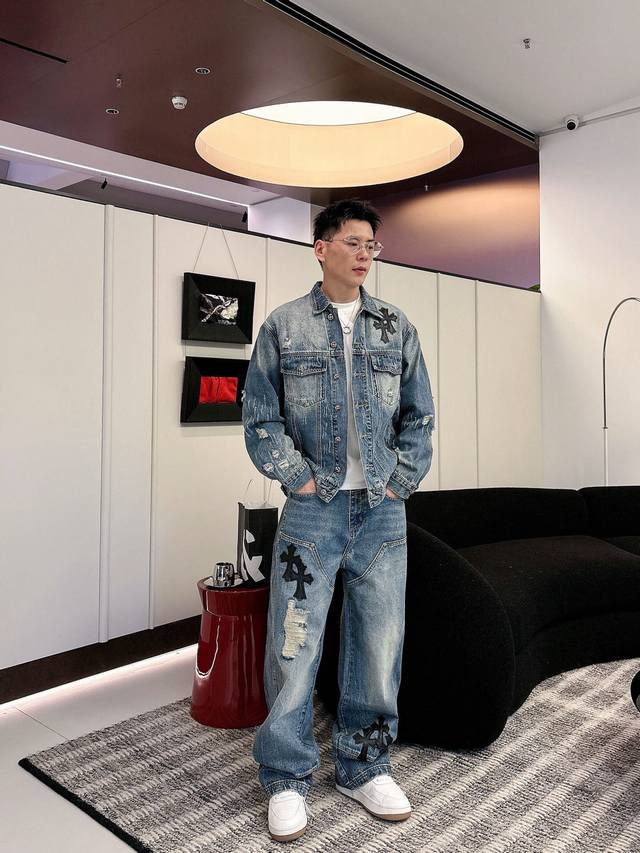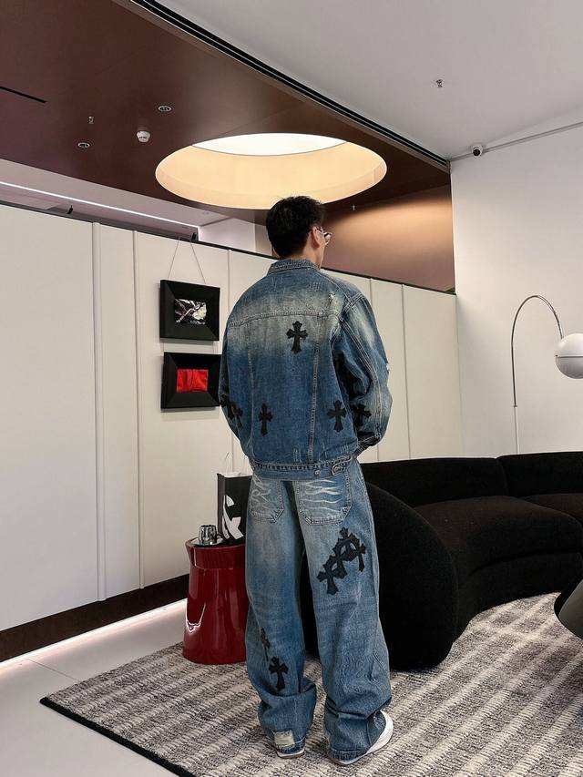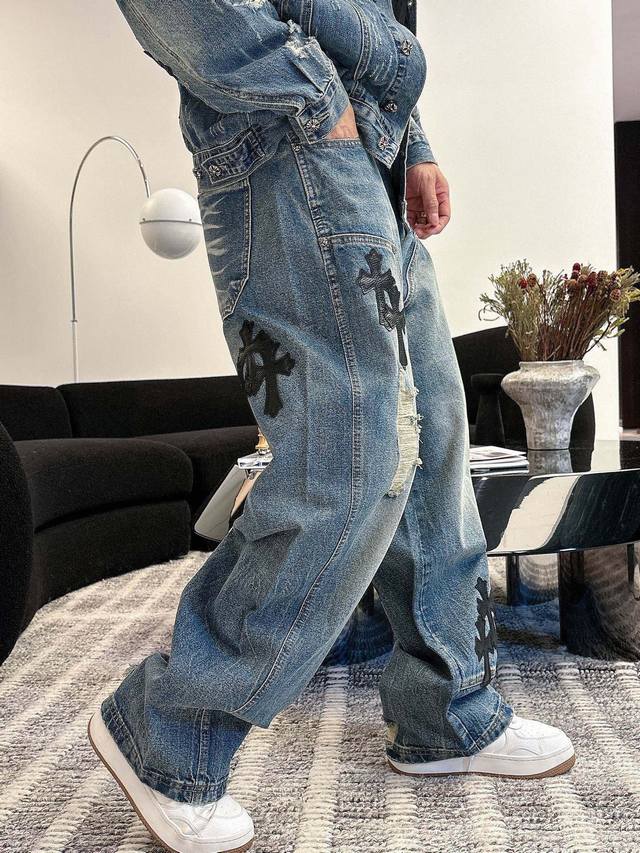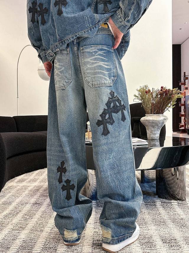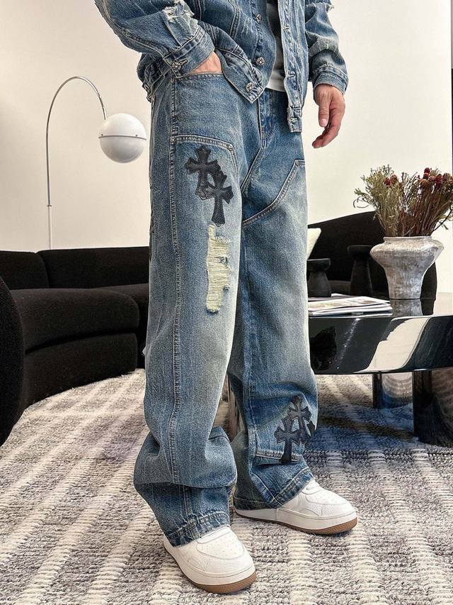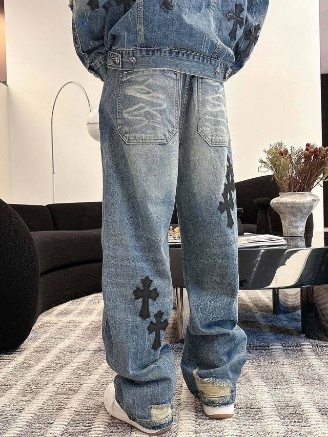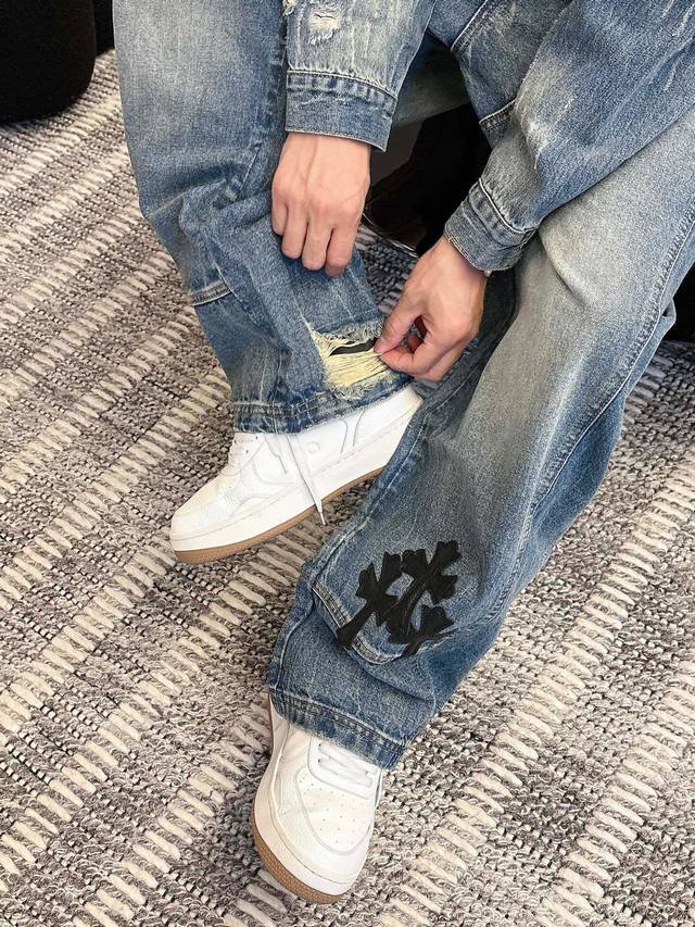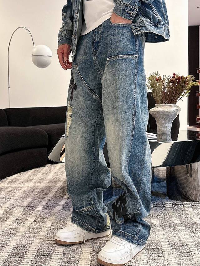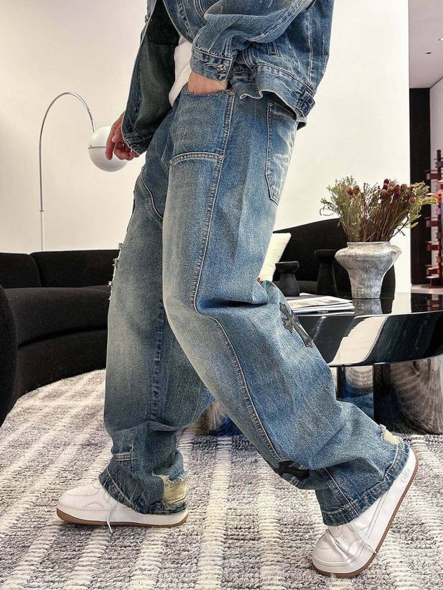 Pants, patchwork leather cross-patterned denim washed long pants, high-end custom pure cotton denim, washed distressed finish, hand-distressed for a comfortable feel, top-notch texture, very clear fabric texture, very high quality!! Highly practical, without excessive embellishment, just a cool look. Effortlessly stylish!