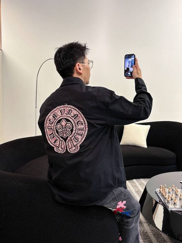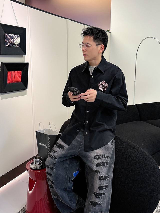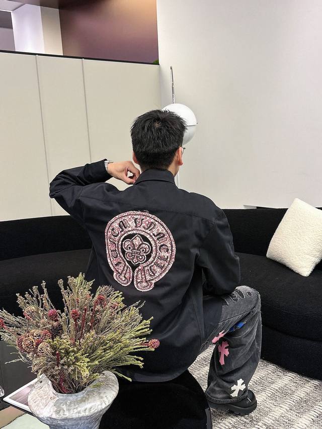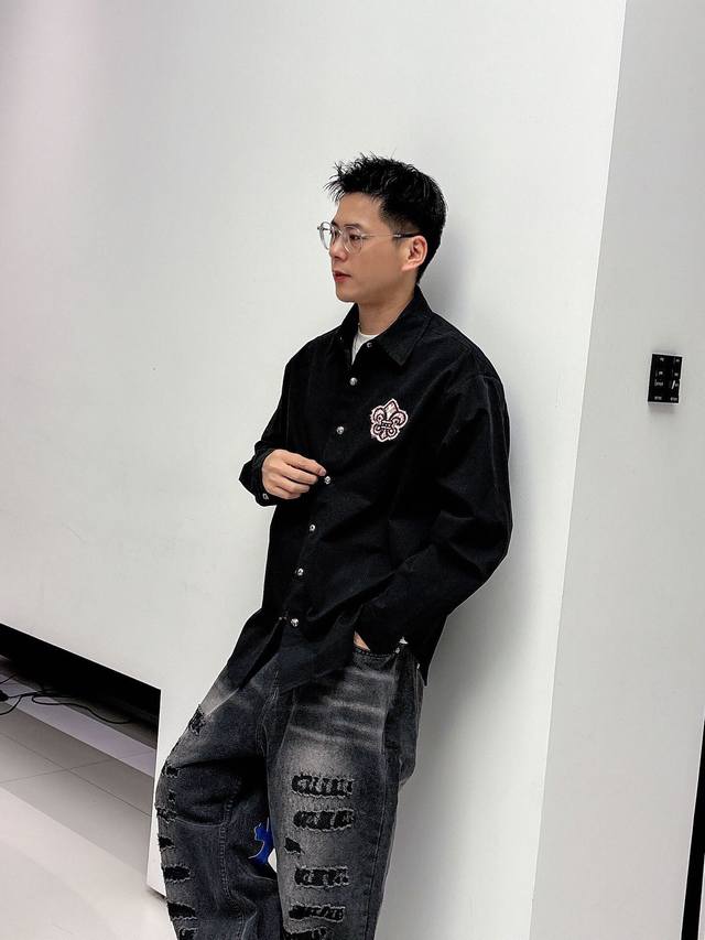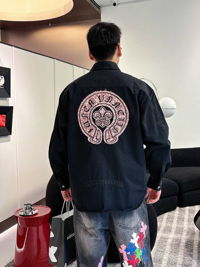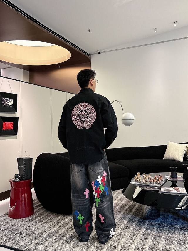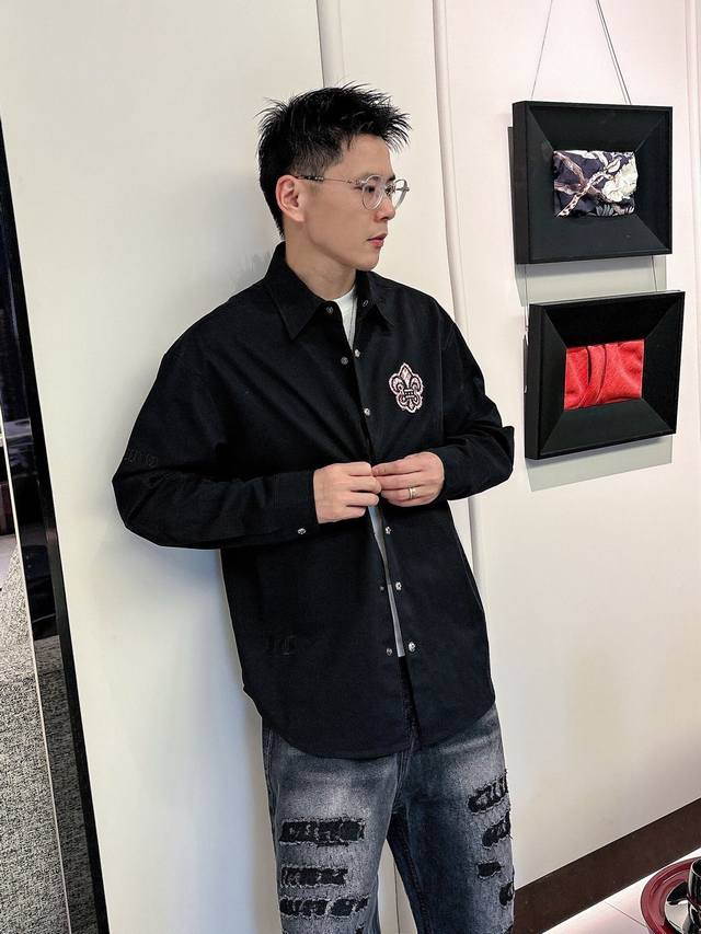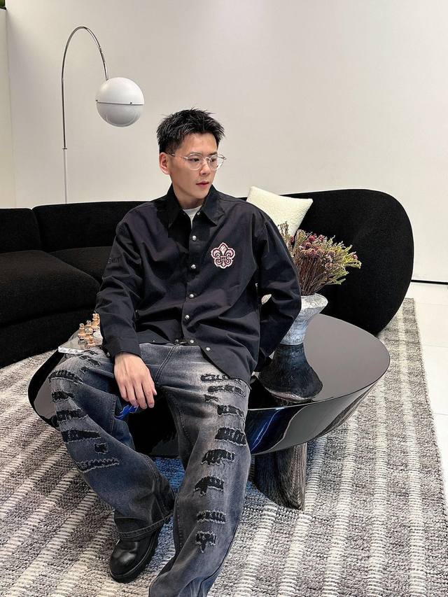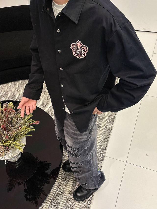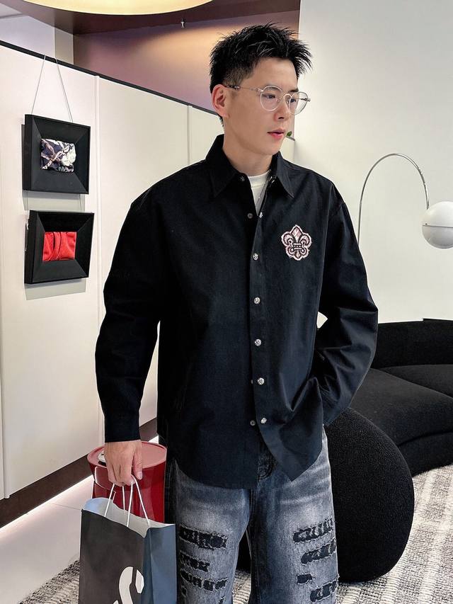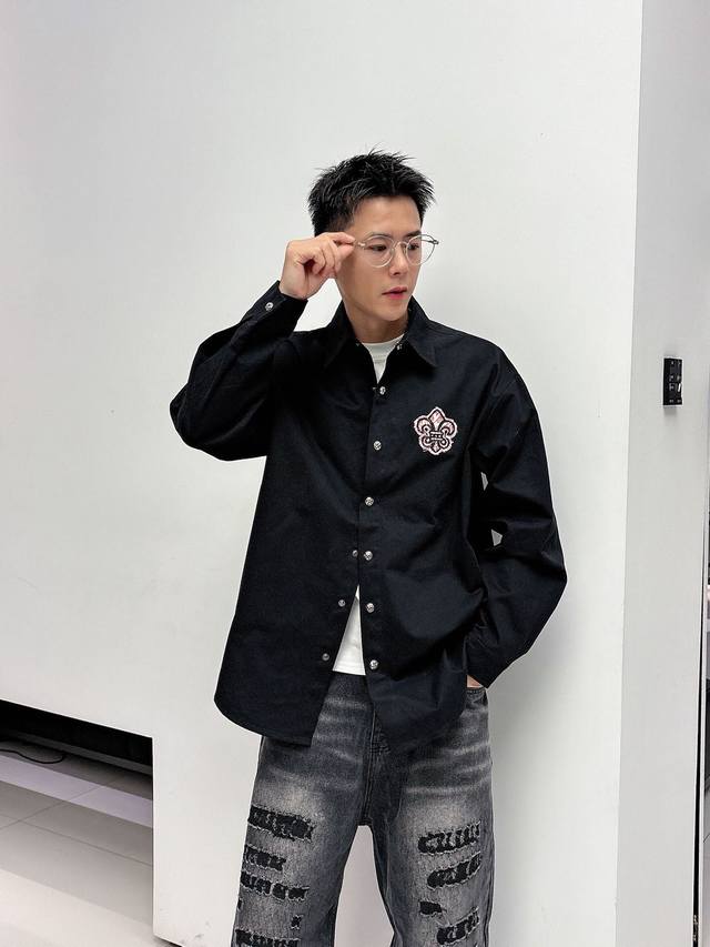Shirt and trousers. Chrome Hearts patchwork embroidered shirt jacket, unisex fit! Made of twill cotton fabric! Clear and smooth texture, wrinkle-resistant and colorfast! The embroidery process is complex and repetitive, requiring very strict standards for the embroidery machine; the spacing is exactly 45cm! Too large or too small, and it won't work! All hardware is engraved and cast, this garment uses a huge amount of material, more than 3 meters of fabric! After the garment is finished, it undergoes high-temperature color fixing and is washed in water at over 70 degrees Celsius, with the addition of softener to make it softer and smoother against the skin! Colors: Black, White Sizes: M-3XL Style Number: 58803753