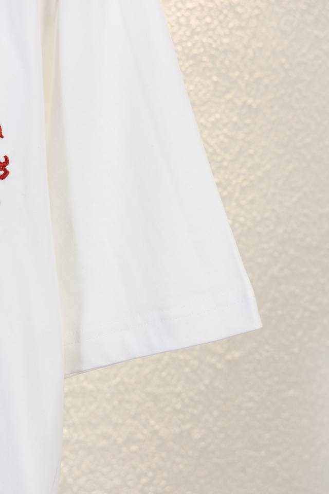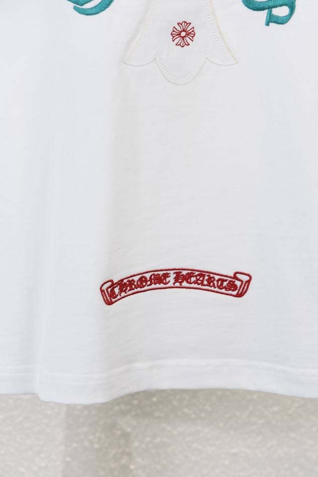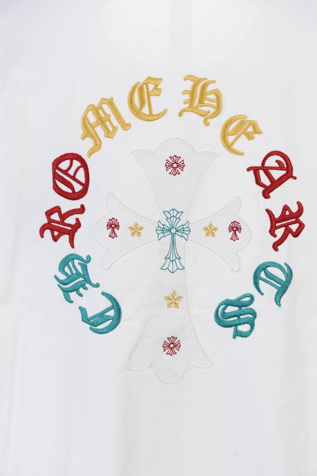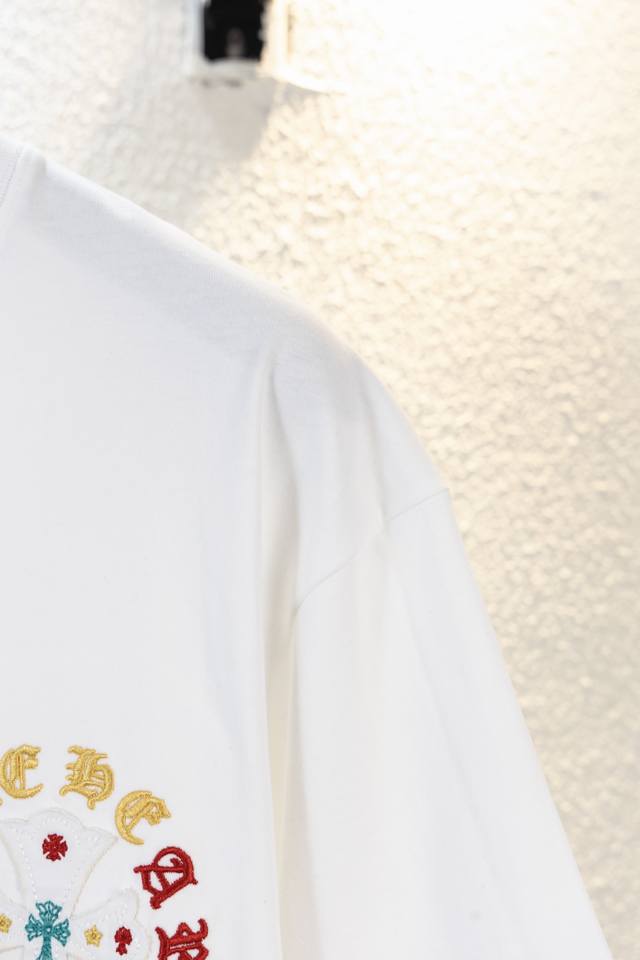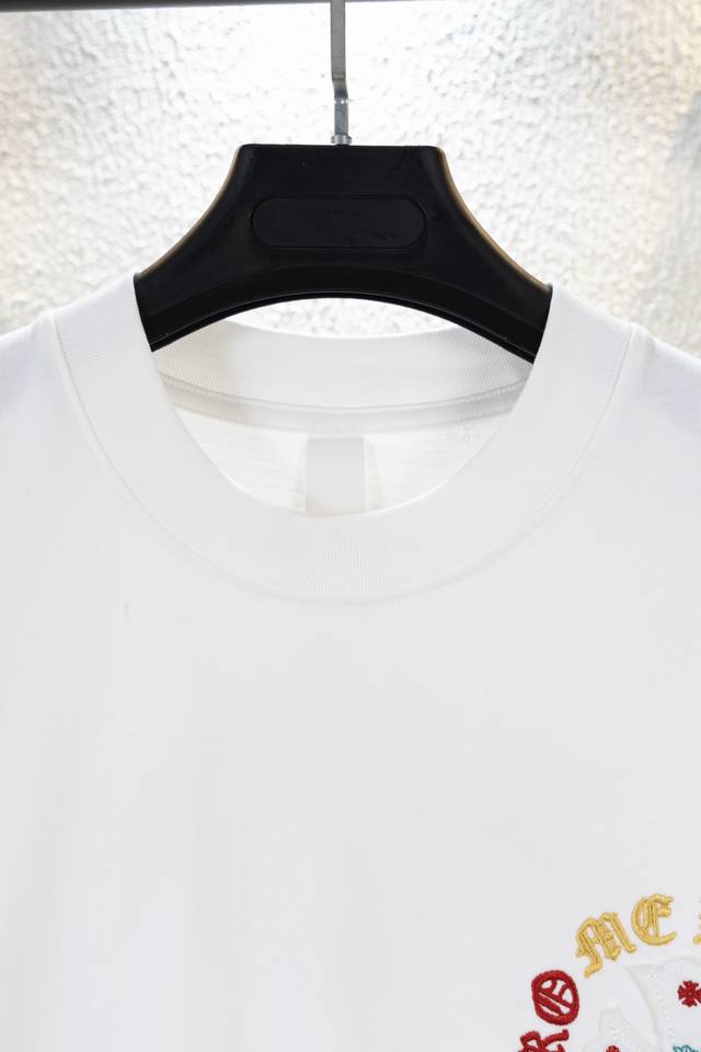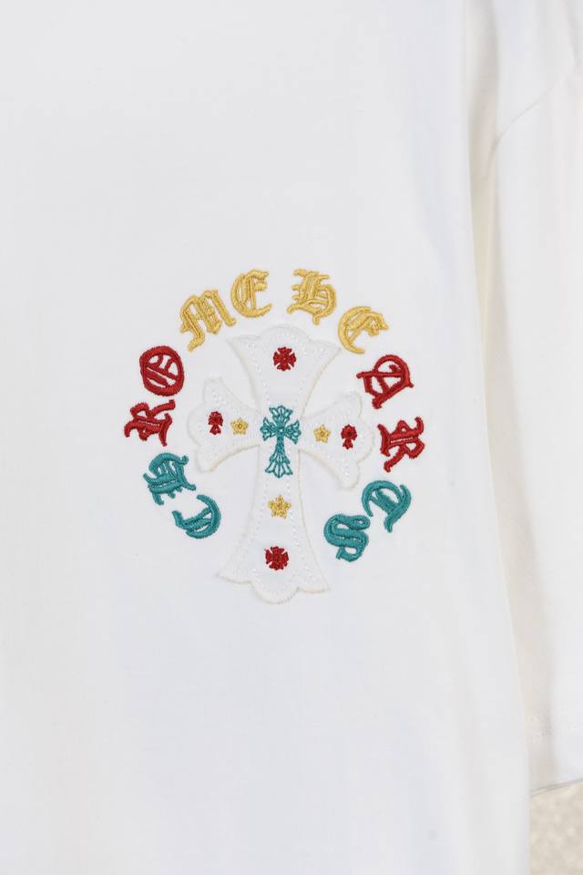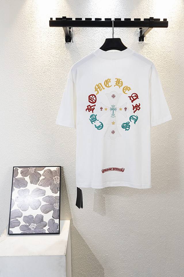 Chrome Hearts Ch 25Ss Summer, 320g high-weight brushed washed double yarn fabric with colorful embroidered Sanskrit lettering. A touch of understated luxury, the mosaic-like colorful embroidered Sanskrit lettering on the front is super beautiful, while the large, meticulously detailed embroidery on the back adds a high-quality feel. A must-have for men's and women's everyday commuting wear. Correct version, welcome to compare! High-weight enzyme-washed custom-woven fabric with an aged wash finish, through-the-shoulder neckline, double-strand four-stitch positioning! Custom main label, unisex!