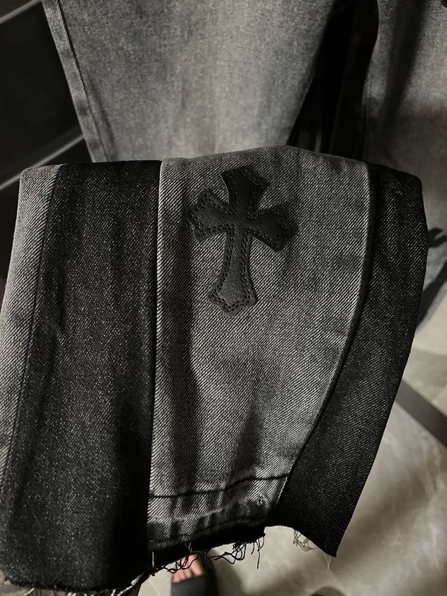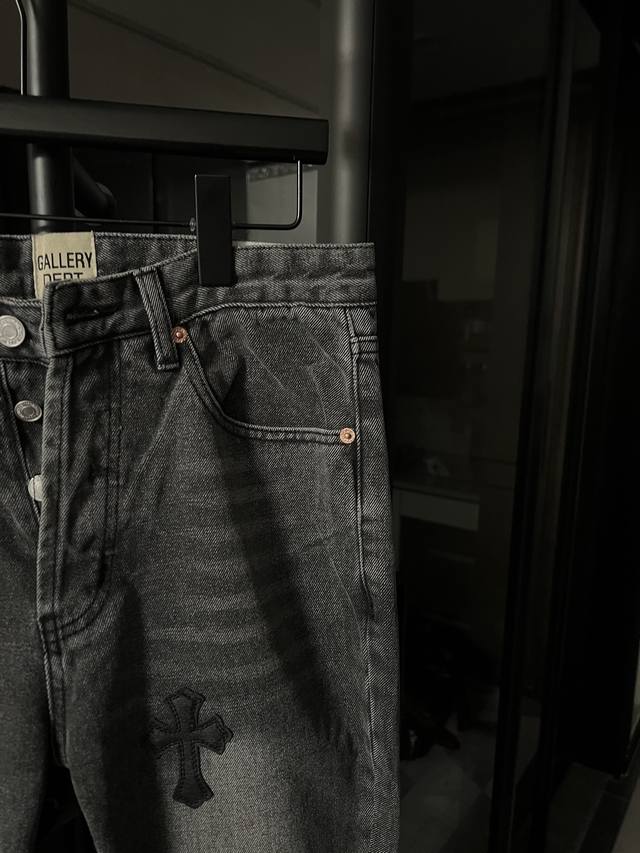 Chrome Hearts Gallery Dept cross-stitch patchwork jeans in iron black.
