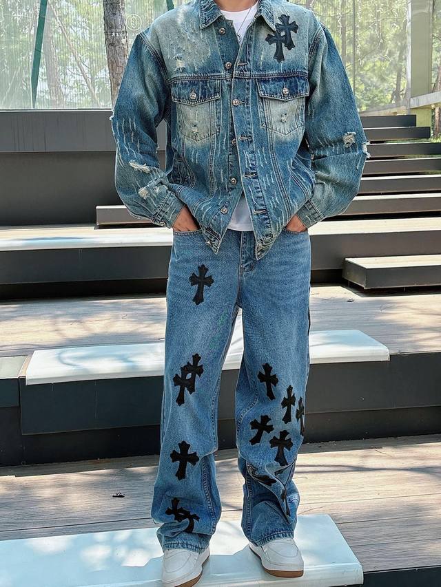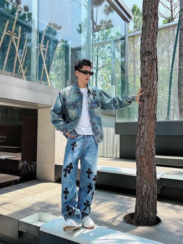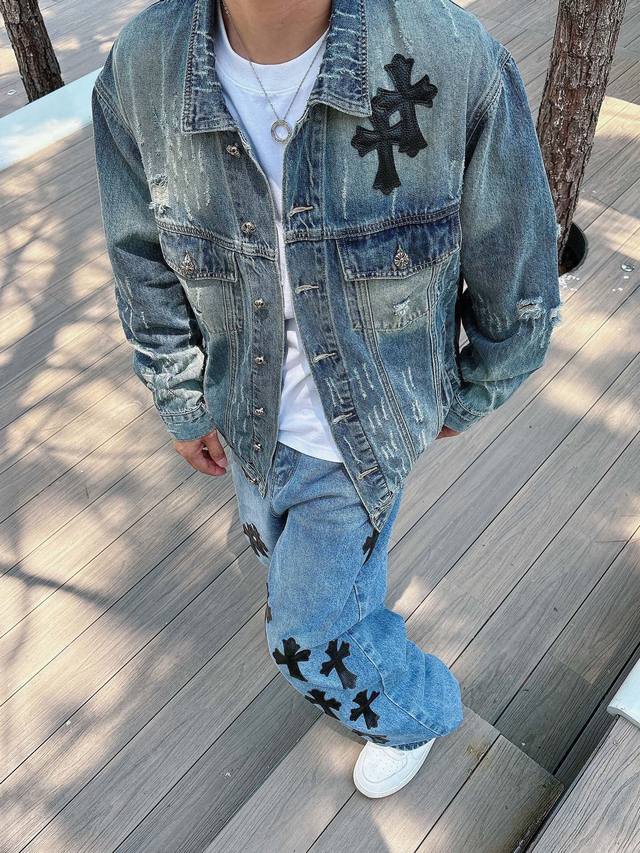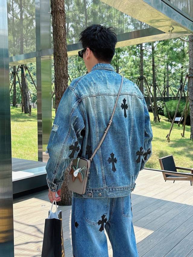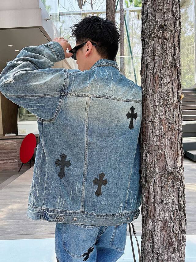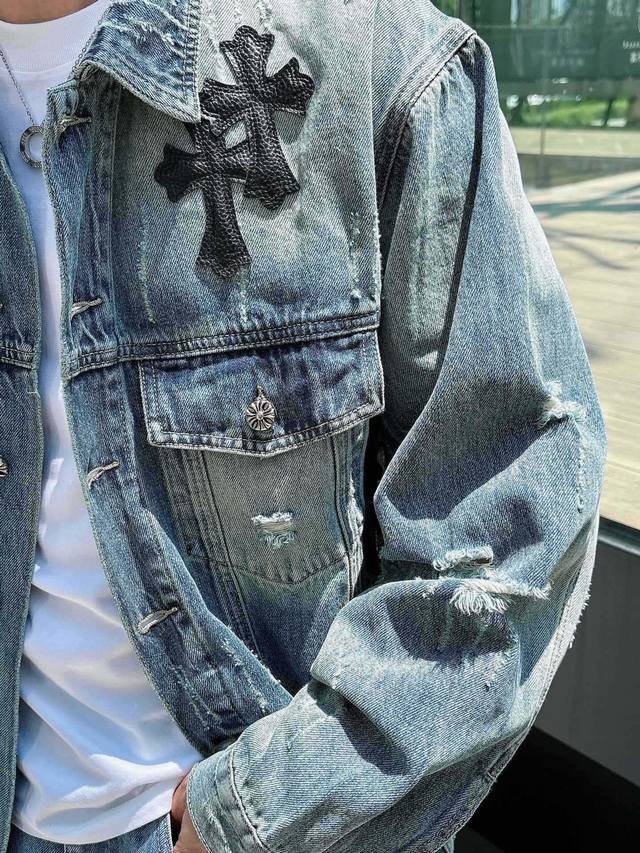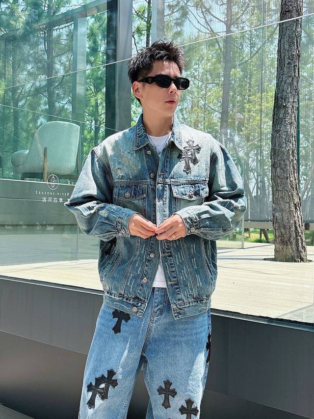 This high-end custom-made pure cotton denim jacket features a patchwork leather cross design, distressed finish, and hand-distressed details for a comfortable feel and superior texture. The fabric's texture is very clear and has a premium feel. Highly practical with minimal embellishments, it exudes a cool and stylish vibe. Effortlessly create a fashionable look! The jacket uses a leather patch to differentiate it from other printed versions. The Chrome Hearts buttons are individually molded, adding a touch of exquisite detail. The classic lapel denim jacket style is eye-catching! Simple, fashionable, and understatedly luxurious! Color: Blue Sizes: M~3X Style Number: 3071