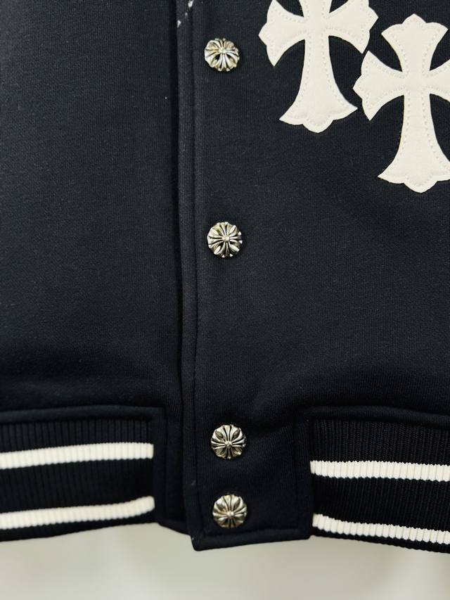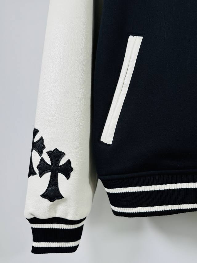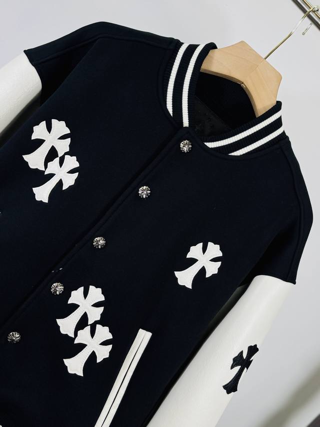 Top-tier real shot, no Photoshop, different from market goods. Chrome Hearts winter collection is here! Sanskrit cross woolen coat with leather sleeves and baseball embroidery. Heavy embroidery on both sleeves, made from a single piece of leather. Same as boutiques, heavy workmanship!! Custom-made thickened woolen fabric, silk lining. Custom-made hardware, not the ordinary version on the market!! Recommended color: woolen with leather. Style number: 25-361. Sizes: S, M, L, XL.