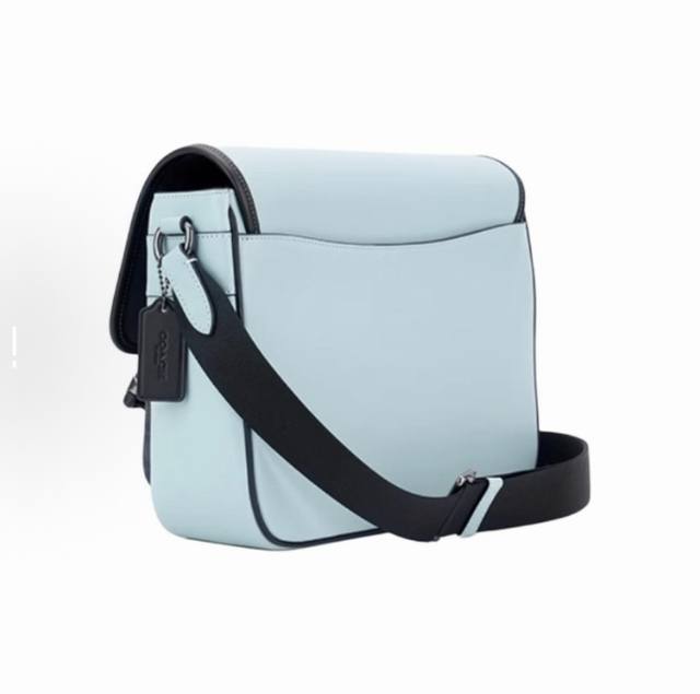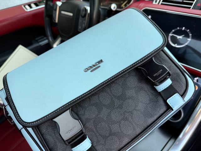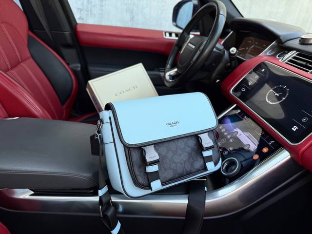 Coach Racer messenger bag in blue color blocking, the latest light blue shoulder/crossbody bag from the Coach boutique, original quality, comes with a boutique folding gift box. Made of cowhide leather, it features an interior multi-functional pocket, snap closure, and fabric lining. It also has an exterior open pocket. Dimensions: 28
