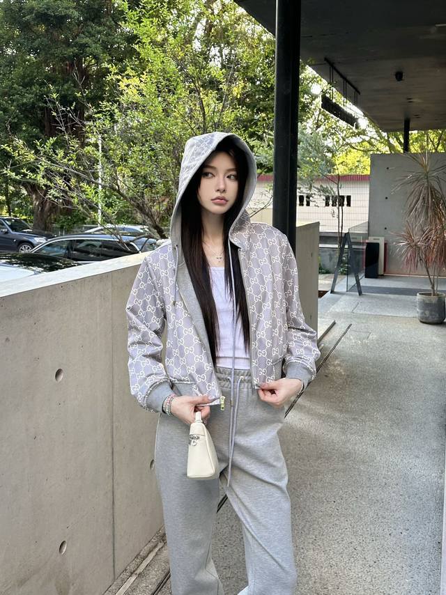G *Gucc* 25Ss early autumn new hooded jacket and wide-leg pants suit with one side printed and reversible version, super straight, two colors and three sizes Sml
