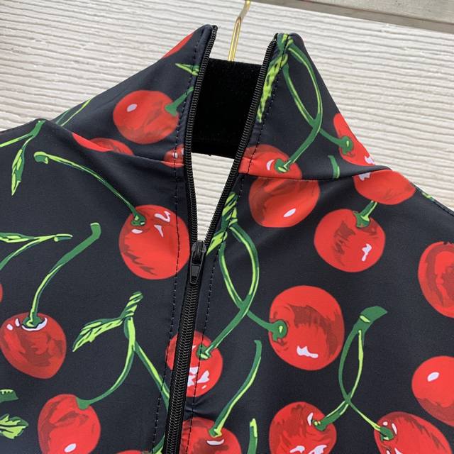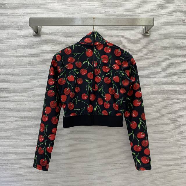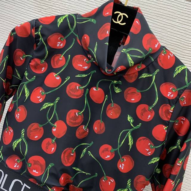 Dolce & Gabbana Dg* New Cherry Print High-Elastic Swimsuit/Gym/Yoga Sports Set! Logo Ribbon Stitched Stand Collar Short Fit Top with Padded Chest, Elastic Slimming Leggings! Sizes S, M, L, L: Shoulder Width 32cm, Bust 78cm, Sleeve Length 56cm, Top Length 39cm, Waist 62cm (Elastic), Pants Length 92cm. (DDD)
