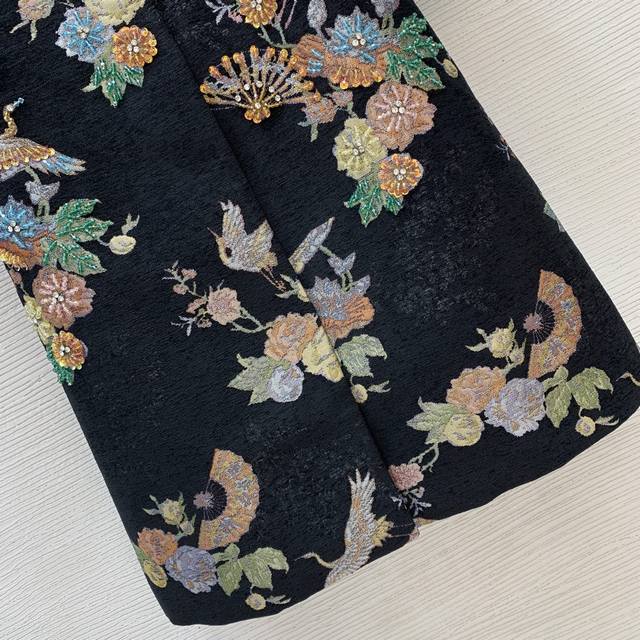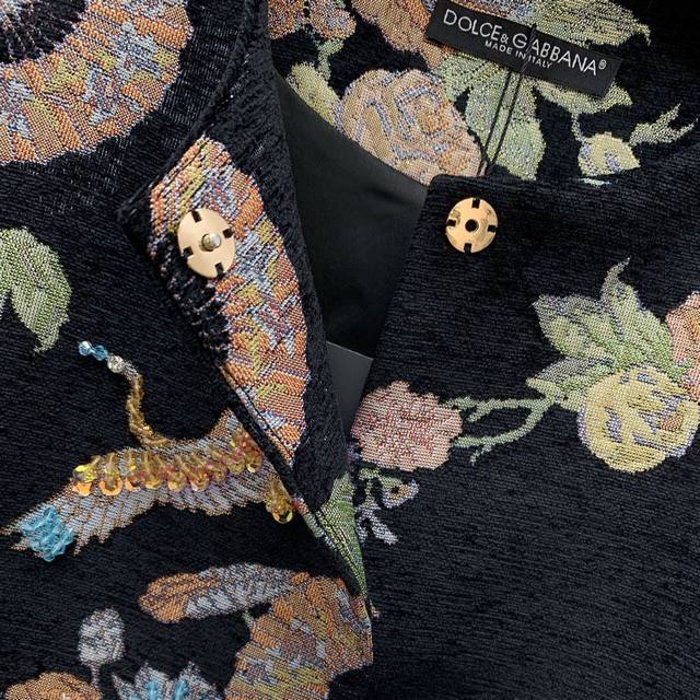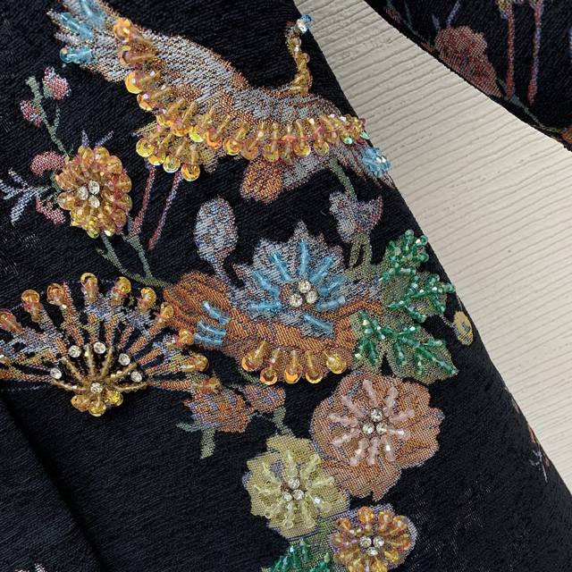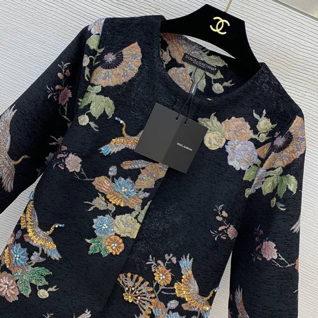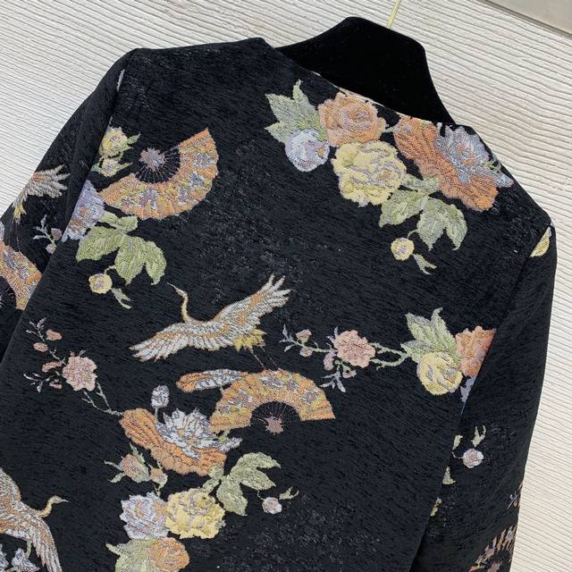 Dolce & Gabbana (Dg*) New High-End Custom Chenille Fleece Fabric, Crane and Flower Fan Pattern, Heavy-duty Rhinestone and Beaded Decoration, Loose Fit, Versatile, Slimming Round Neck, Three-Quarter Sleeve Coat, Mid-Length! Black, Size S: Shoulder Width 35cm, Bust 94cm, Sleeve Length 44cm, Length 86cm. (DDD)