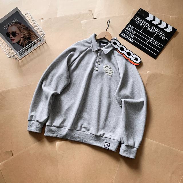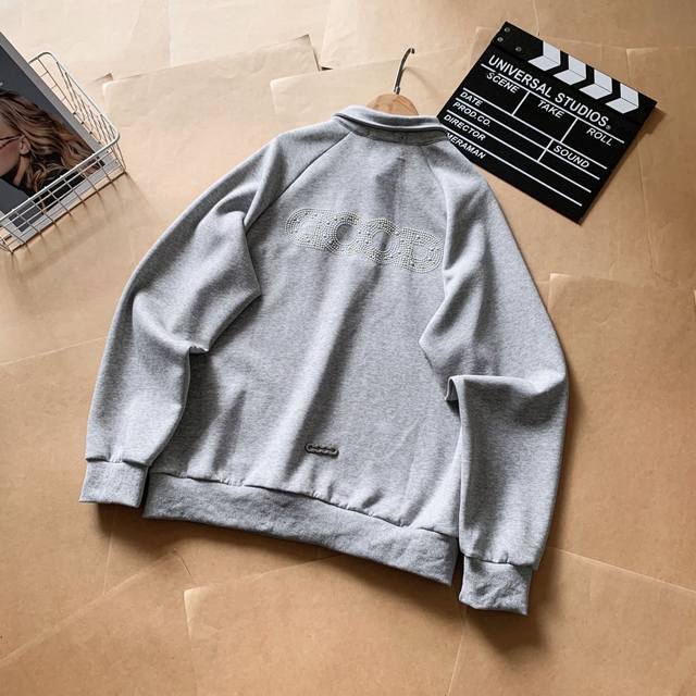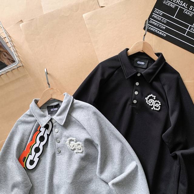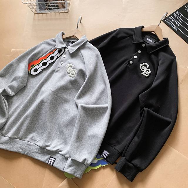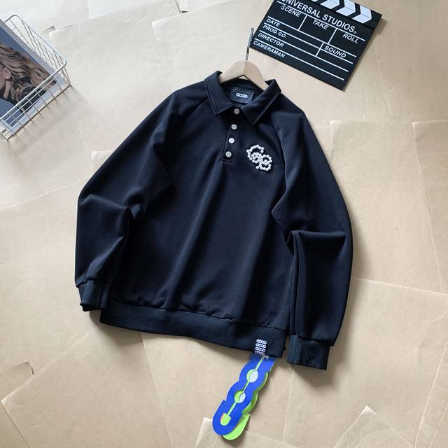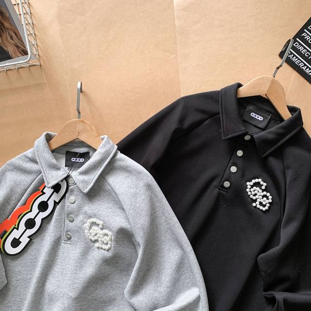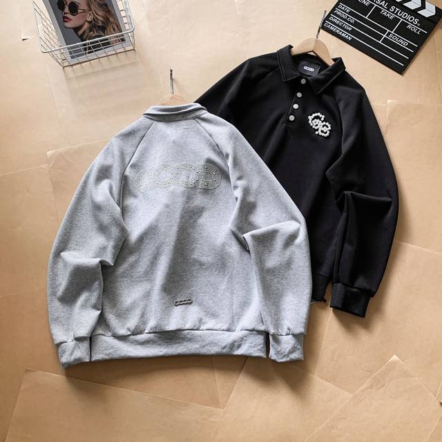 Goodbrand Gb Pearl Rhinestone Polo Neck Long Sleeve Pullover Loose Sweatshirt for Couples