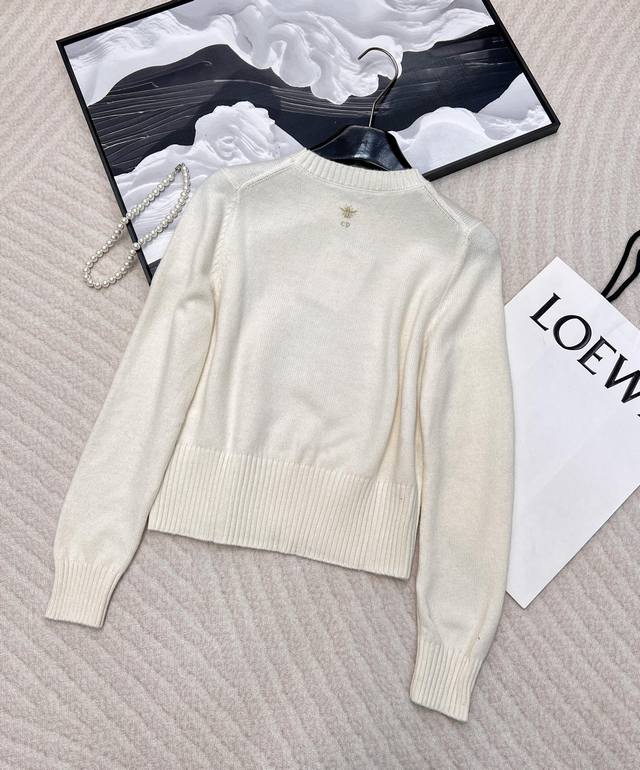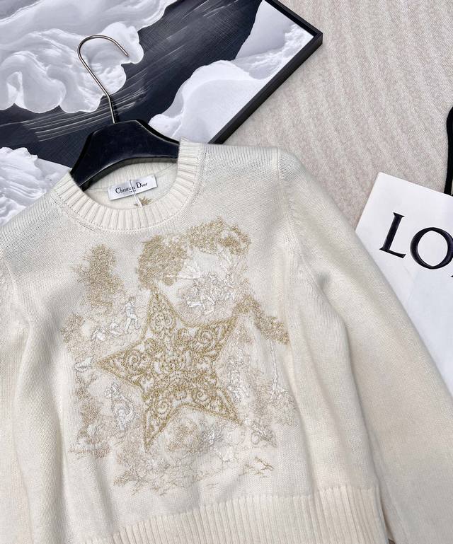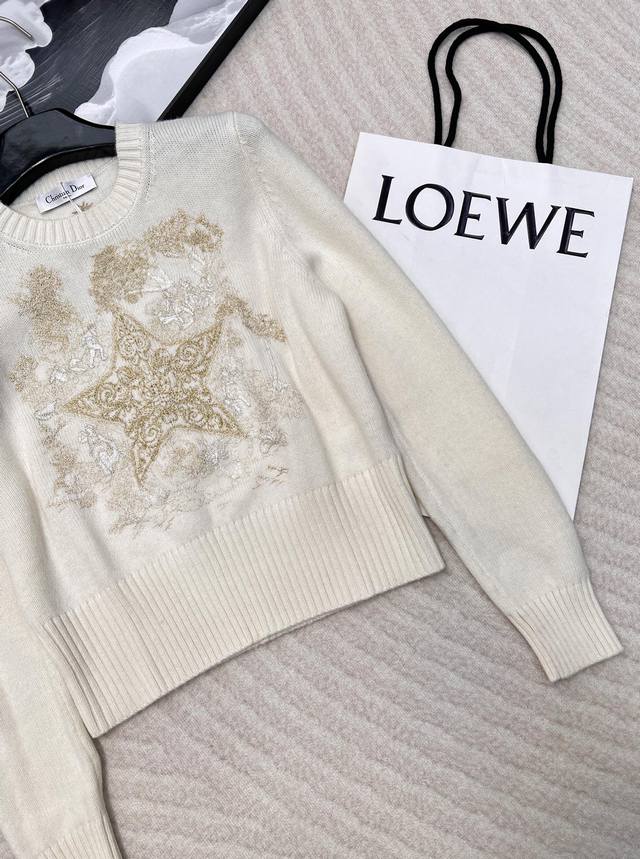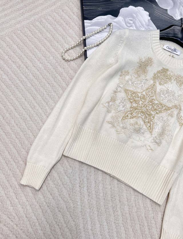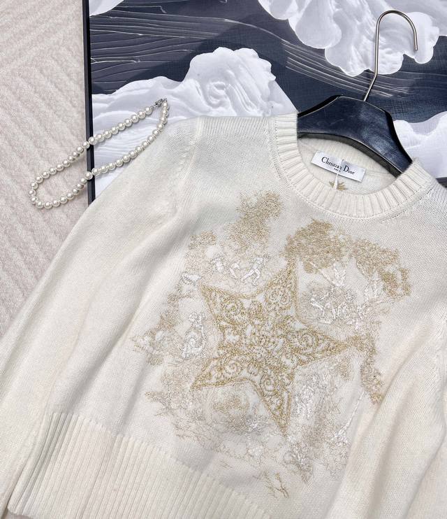 Dior five-pointed star gold thread embroidered knit top. The original yarn has an amazing texture; a must-have high-end piece for sophisticated women! The contrasting logo adds a touch of understated luxury. The classic cut is universally flattering, exuding an elegant and youthful vibe! The contrasting color adds a touch of sophistication; it looks great worn alone or layered, looking chic and elegant! Fashionable and high-class! Sizes S, M, L, D Code