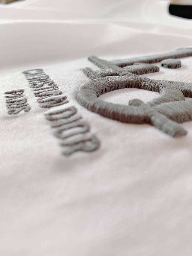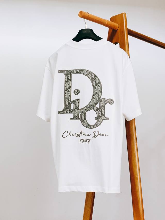 short-sleeved embroidered T-shirt from the Dior Homme Spring/Summer 2025 collection. A fusion of classic and refined, this piece features a classic solid color base for a clean, simple look. The front chest features a three-dimensional embroidered "Dio*" logo and "Christian Dio* Paris" lettering, creating a refined, luxurious feel. The back is a true highlight, featuring the oversized "Dio*" lettering integrated into a classic monogram pattern. The handwritten "Christian Dio* 1947" below echoes the brand's heritage. From the embroidery to the graphic design, every detail showcases the brand's luxury and craftsmanship, effortlessly creating a stylish statement.