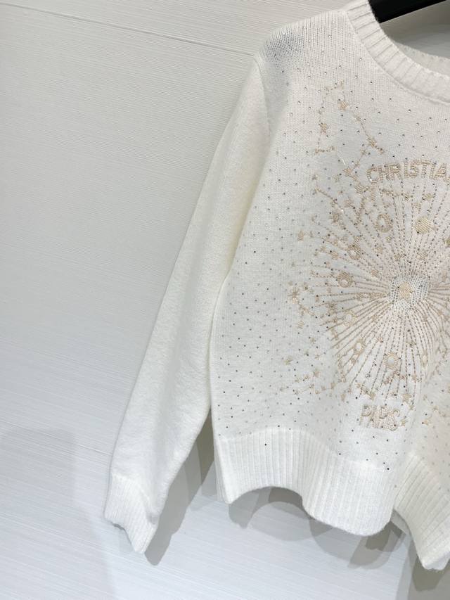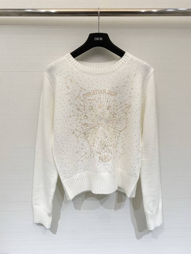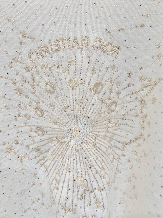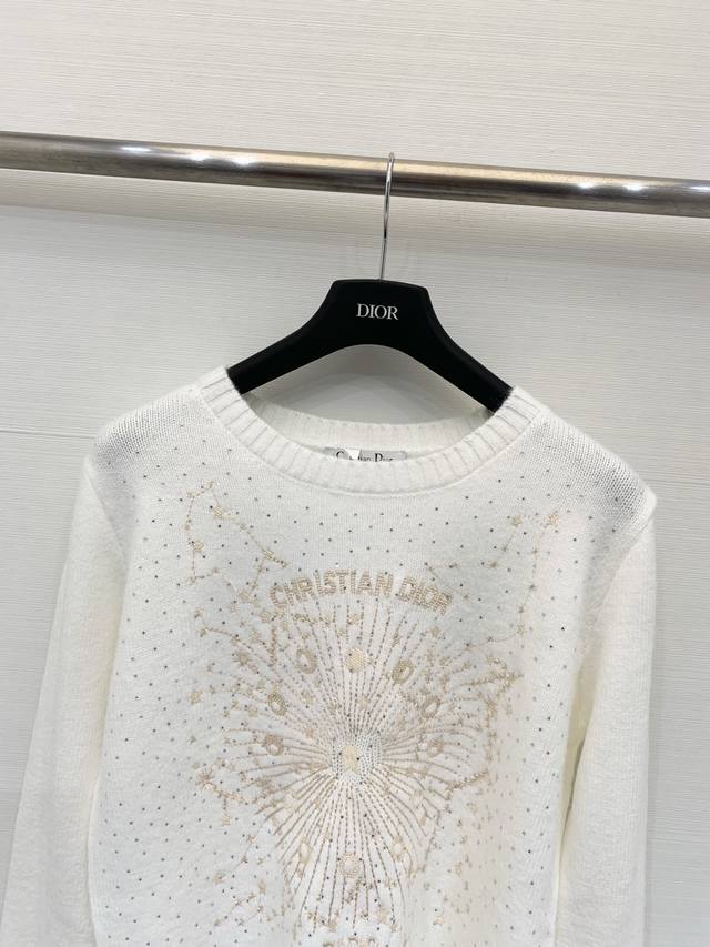 Dior Spring/Summer 2026 New Arrival: Wool Knit Crew Neck Long Sleeve with Gold Thread Star Embroidery. Crafted from soft wool fabric, this dress is adorned with the brand's signature star jacquard pattern throughout, featuring embroidered logo on the chest. It has a crew neck and dropped shoulders. Available in unisex styles in sizes S, M, L, and D.