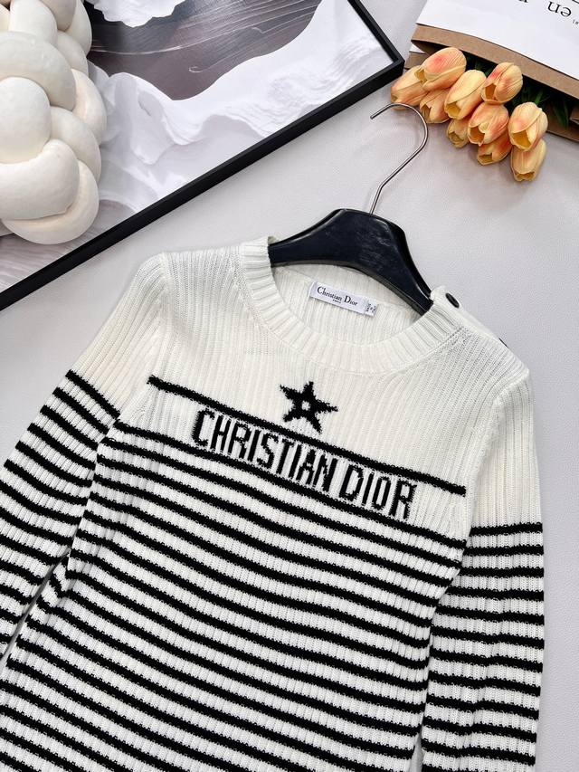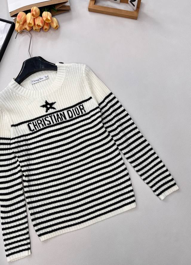 Dior striped five-pointed star wool knit sweater, adorned with embroidered five-pointed stars, stylish and youthful. The fabric is soft, lightweight, and comfortable, completely breathable, and the design is excellent. It looks great with any everyday outfit; the classic striped design is timeless and exudes a youthful, girlish charm. A must-have basic for wealthy young ladies, a must-have for everyone and very fashionable~ All tags are complete, available in three colors. Sizes S, M, L, D. Code D.