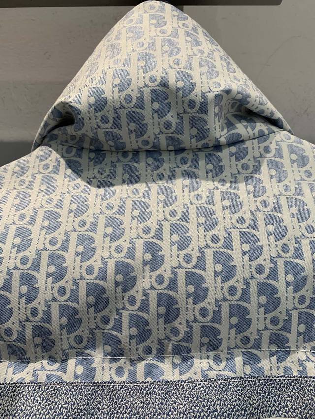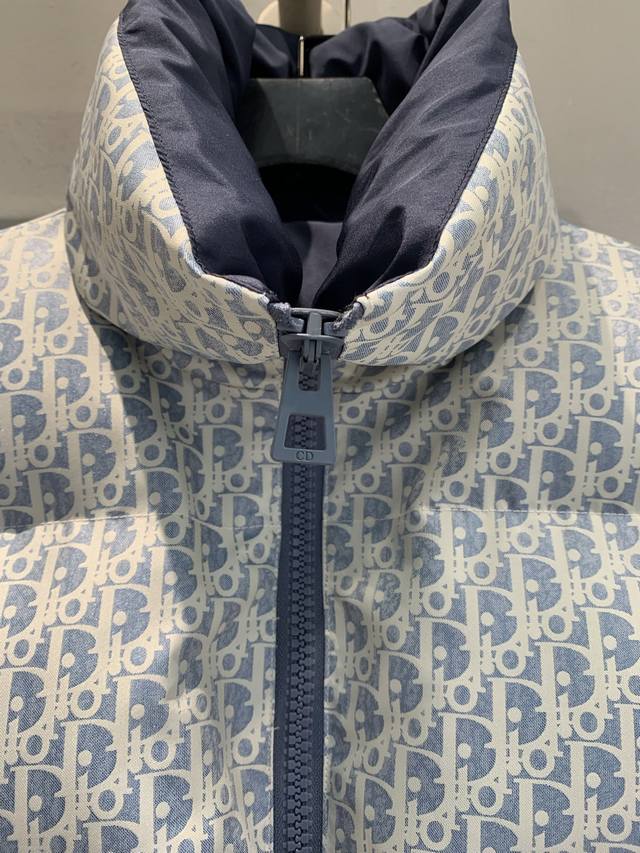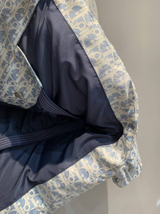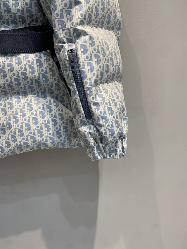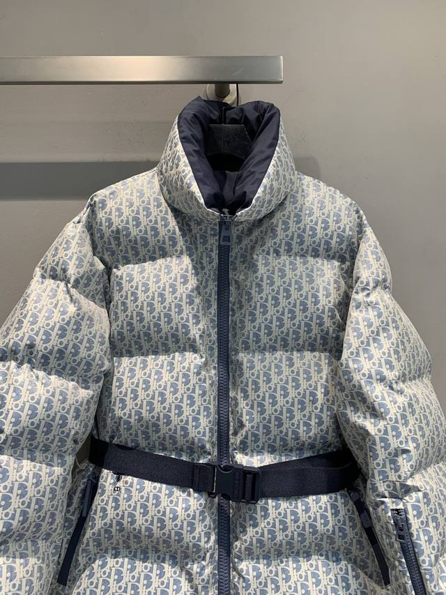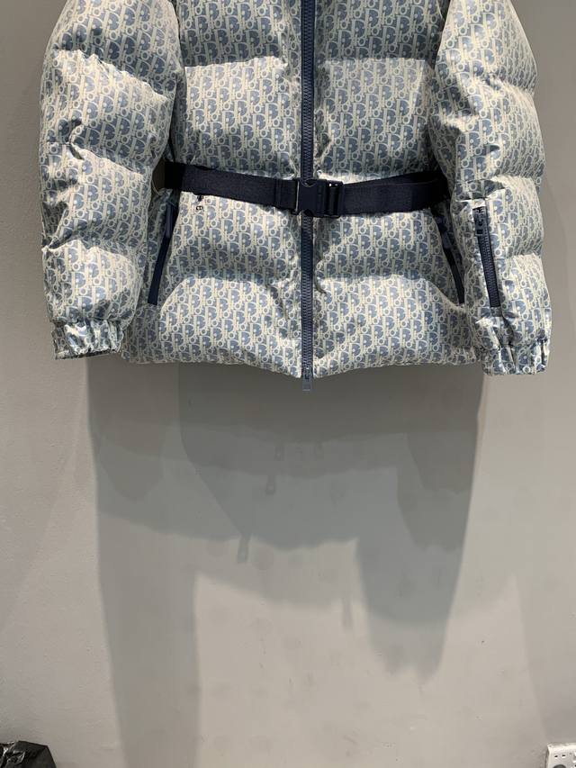 New Arrival! Cd 2025 Autumn/Winter Alps Ski Series Stand Collar Slim Waist Monogram Down Jacket. Blue quilted taffeta fabric with Oblique print, a perfect blend of sporty style and haute couture craftsmanship. Stand collar design + side zip pockets, technical waist belt to accentuate curves, tonal Christian Dior logo on the back. Perfect details. Sizes: 36 38 40