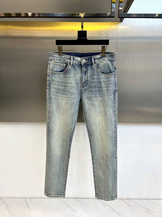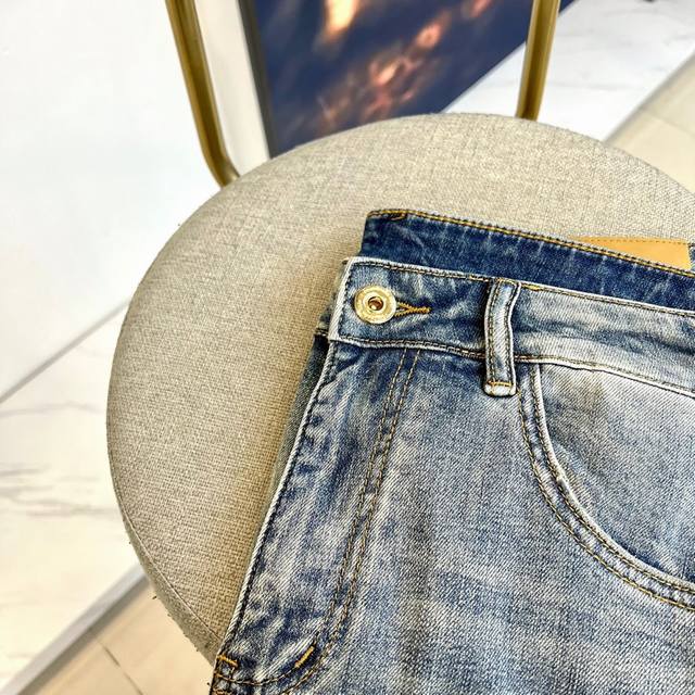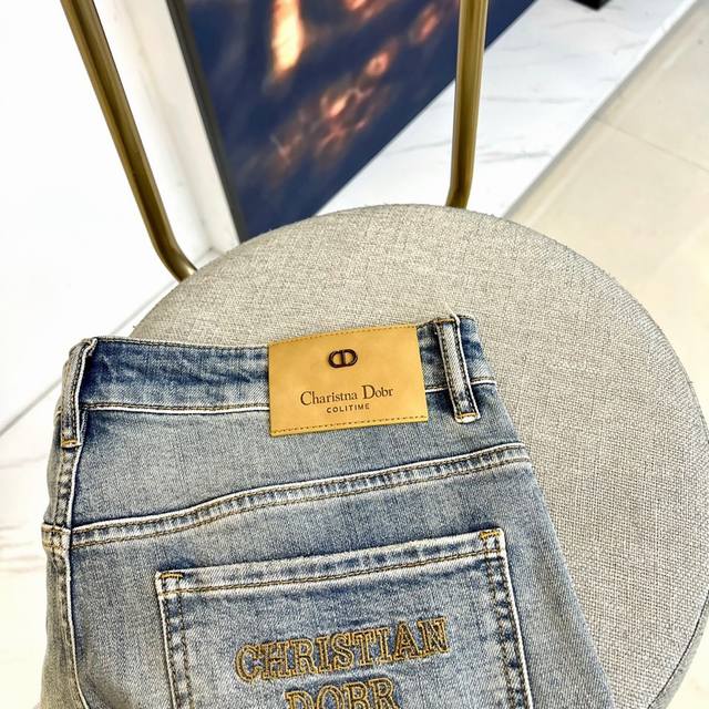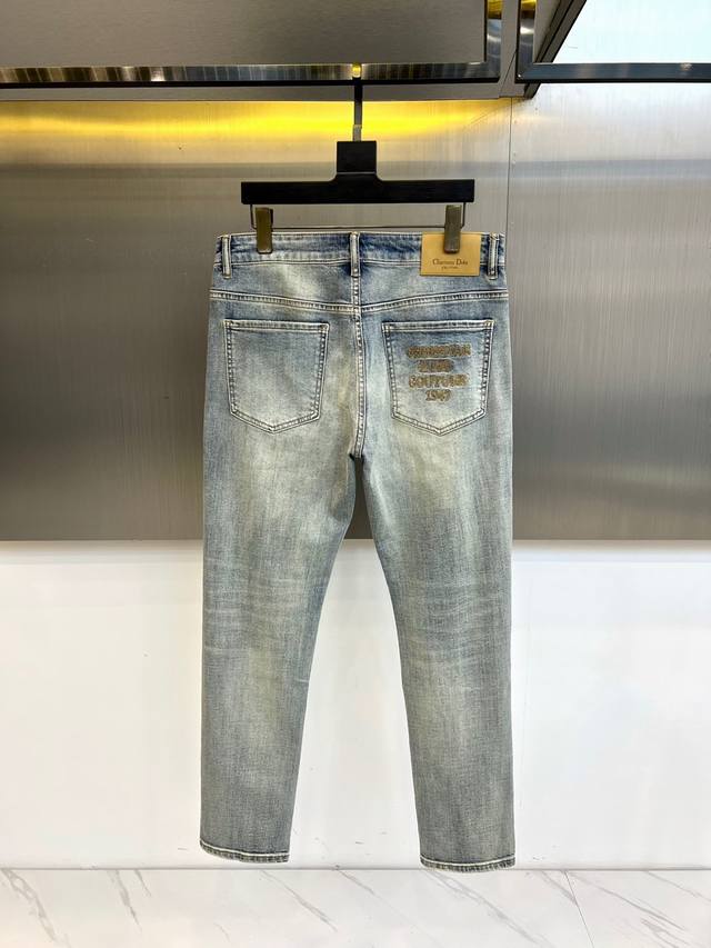 Christian Dior's new jeans for Fall/Winter 2025 showcase modern luxury in a classic light blue hue. Crafted from high-quality denim, these jeans are elegantly cut for a slim silhouette. The back pockets feature gold embroidery of "Christian Dior Couture 1947," a nod to the brand's legendary 1947 origins. The brown leather label showcases exquisite craftsmanship in every detail. The overall design is simple yet sophisticated, with the light blue hue blending effortlessly with the Fall/Winter wardrobe. Gold accents and leather accents elevate the overall look, showcasing understated chic. The gray walls and gold armchair in the background suggest a pair perfect for everyday wear by the urban elite. Whether paired with a coat or a sweater, they exude uninhibited elegance. As a core piece from Dior's Fall/Winter 2025 collection, these jeans blend classicism with innovation, perfectly embodying the brand's commitment to high fashion and allowing every wearer to experience the timeless allure of French luxury. 29-38 No 37