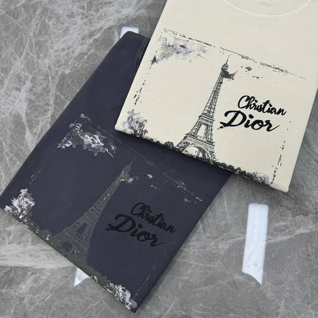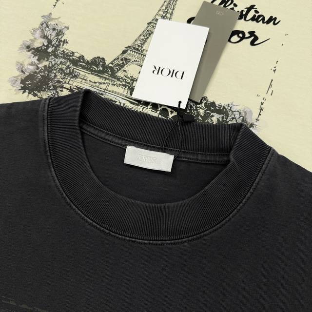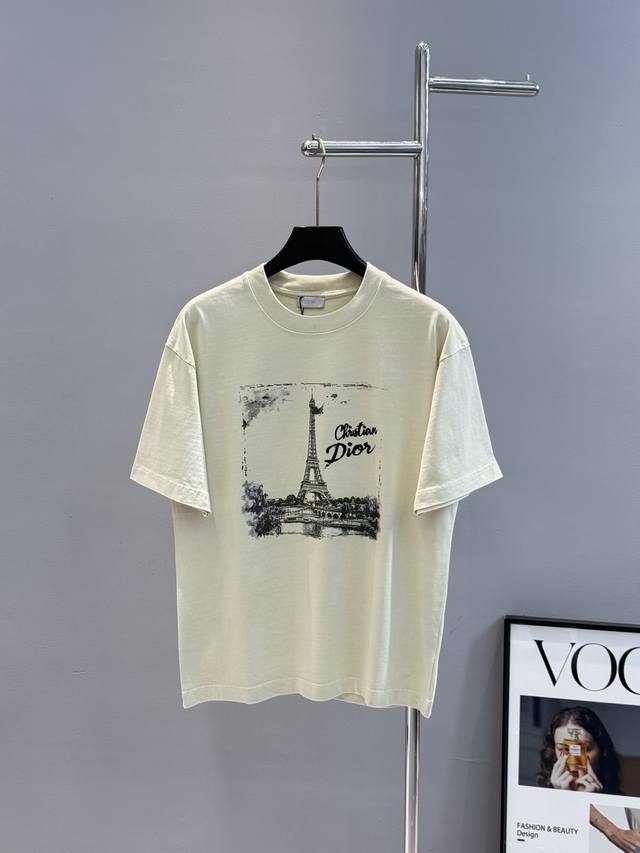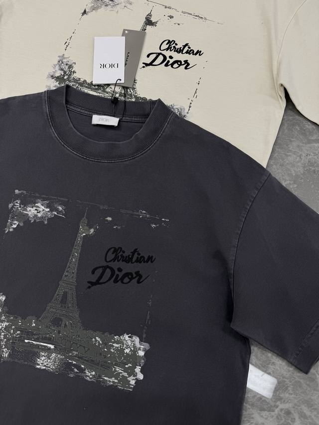 Dio*R Dior 25S new trendy brand T-shirt. Unisex! Heavy wash series. Eiffel Tower graphic design. Matching brand letter hot velvet. Fashionable and age-reducing. High temperature heat transfer process. New method. Heavy wash 320G pure cotton fabric. Super comfortable to the skin. Straight and stylish! Three labels! Color: gray, beige. Size: M-3Xl slightly expanded version! 175 145 catties recommended L
