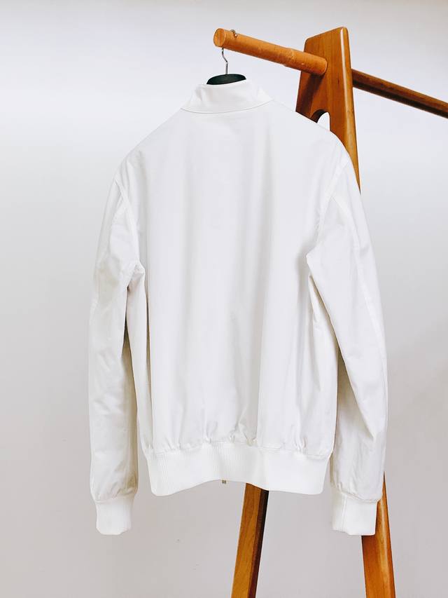 collar fits snugly around the neck, ensuring comfort while maintaining a sharp appearance. The branded zipper closes smoothly, and the metallic pull gleams subtly in the sunlight, adding a touch of luxury to the jacket's details. Ribbing on the cuffs and hem enhances the fit and keeps out drafts, while also lending the jacket a retro, sporty feel that balances beautifully with the jacket's overall elegance. The
