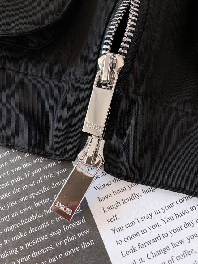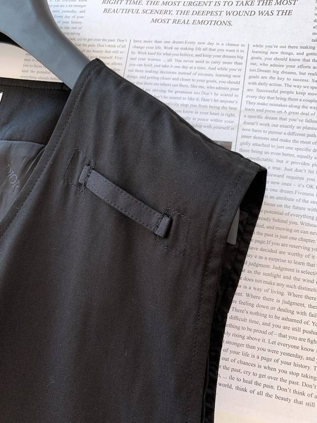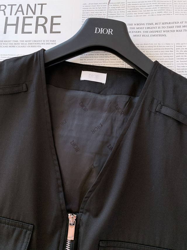 , features a deep black color scheme that imbues this vest with an inherently luxurious feel. The front zipper is crafted from high-quality metal for a smooth, easy-to-open design, and the brand's signature logo is clearly engraved on the pull, adding a refined touch. Every zip and closure evokes the brand's elegant style. The discreet "Christian Dio* Couture" embroidery on the back pocket is delicate and refined, instantly recognizing its distinguished heritage. The all-over brand logo lining showcases the brand's meticulous attention to detail, creating a thoughtful and luxurious look.