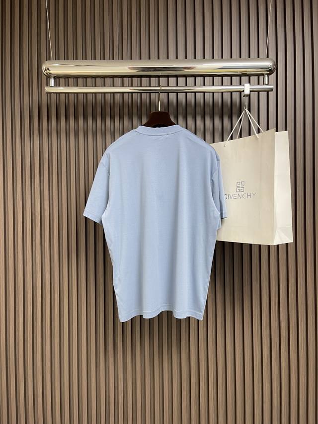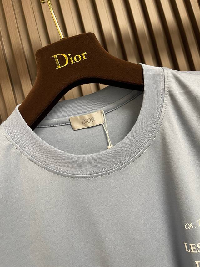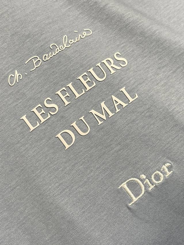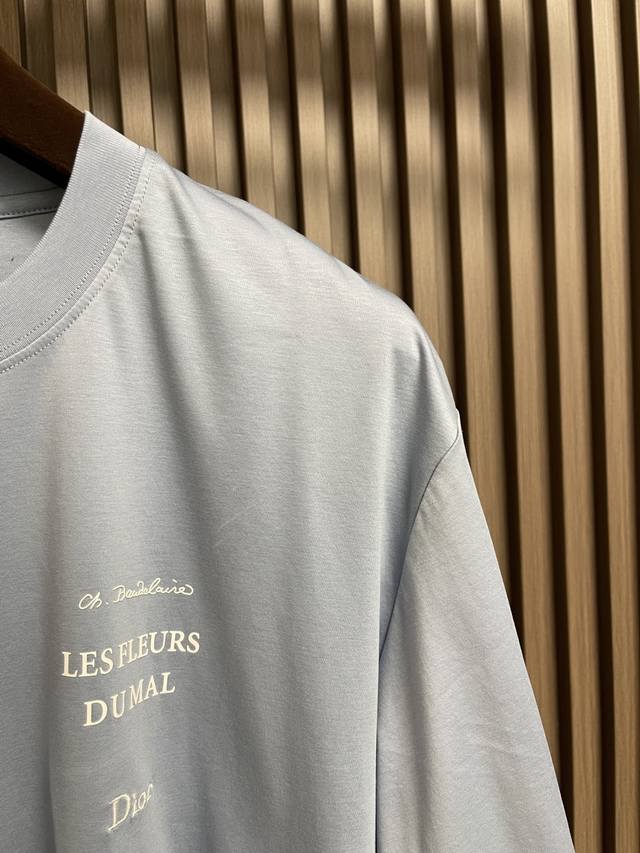 Dior's blue couple's round-neck short-sleeved T-shirt, with a light blue background, captures a clear spring sky, pure and soothing. The exquisite embroidery on the chest, "Les Fleurs Du Mal," carries the poetic spirit of Baudelaire, interwoven with the Dior logo, creating a romantic encounter between fashion and literature. The 99% cotton + 1% polyester ratio makes the fabric soft and skin-friendly yet crisp, making it comfortable to wear alone or easily paired with other items for different occasions. The exquisitely crafted seams, from the neckline to the hem and cuffs, show meticulous craftsmanship in every detail, infusing a sense of luxury into the design. Sizes: Xs-L