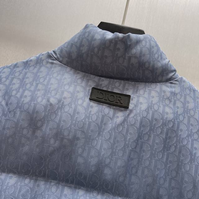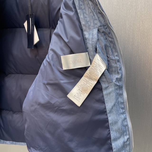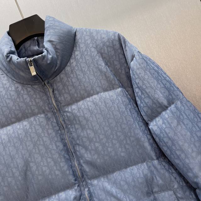 Cd Jacquard Blue Down Jacket Ddd Size: S-XL Ddd This down jacket highlights Dior's classic Oblique print. Crafted from a blue cotton blend, it features a Dior rubber patch on the back, a stand-up collar, and patch pockets for a distinctive look. The all-over pattern exudes sophistication, while tonal graphic details elevate any outfit. DDD