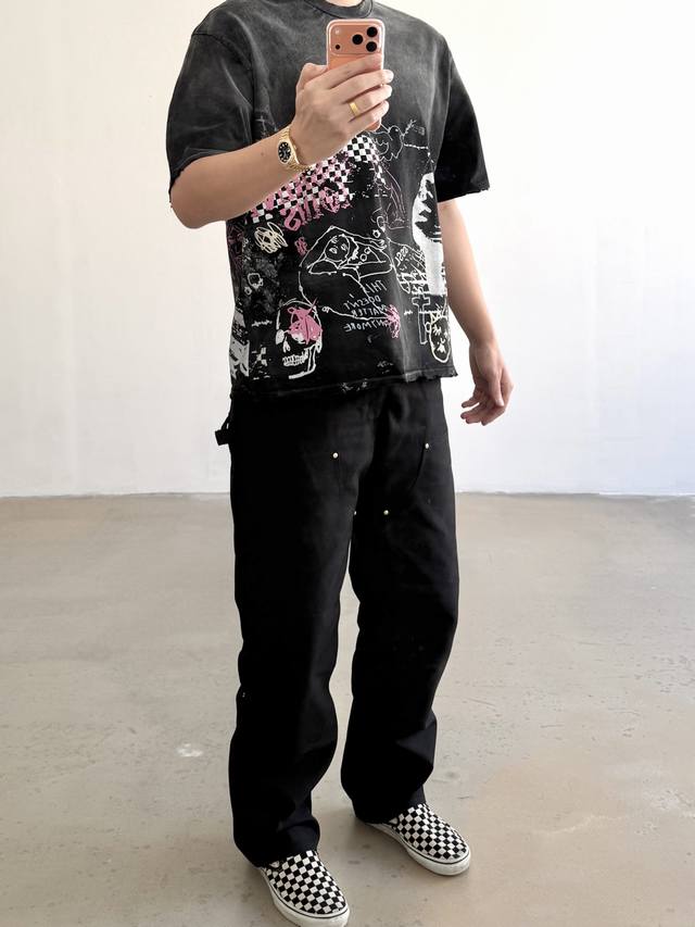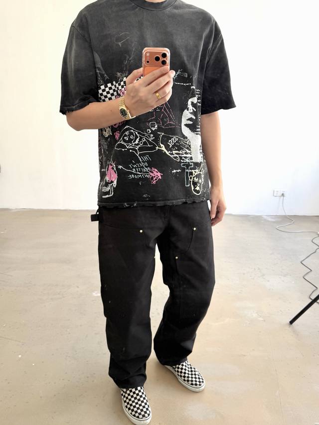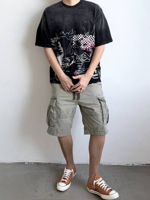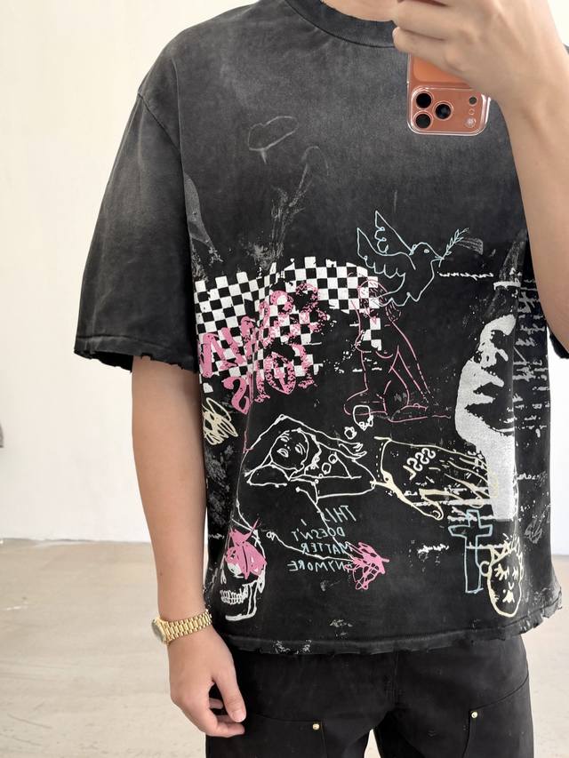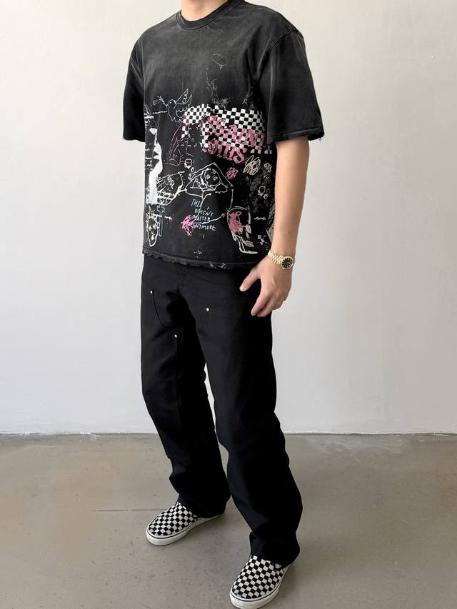 Cts-120 Saint Street Dirty Street Hand-Painted Graffiti Style T-Shirt with Single-stitch Top and Bottom Stitching + Multiple Hand-Distressed Features + Heavyweight Assault Fermentation Sprayed Monkey Washing Process, Full of Retro and High-End Feel. Sizes: SML XL DDD