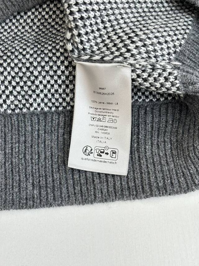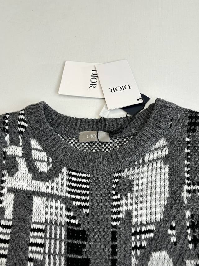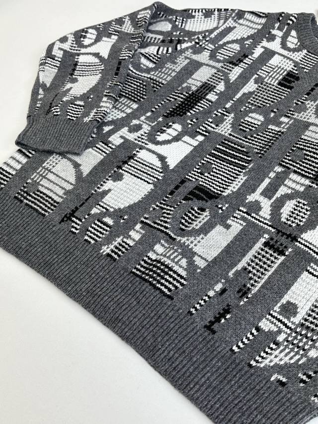 Dio* Dior Oblique Printed Wool Jacquard Crew Neck Knit Sweater (DDD) The sweater features an all-over knit design showcasing the brand's signature lettering and check pattern. It has a crew neck design and a relaxed fit. The main material is 100% wool. The body and sleeves feature a three-dimensional knit texture combining Dior lettering and check patterns. The neckline, cuffs, and hem are ribbed. High-quality (DDD) Size: Xs SML (DDD)