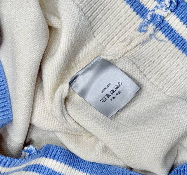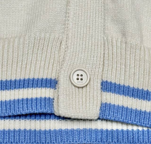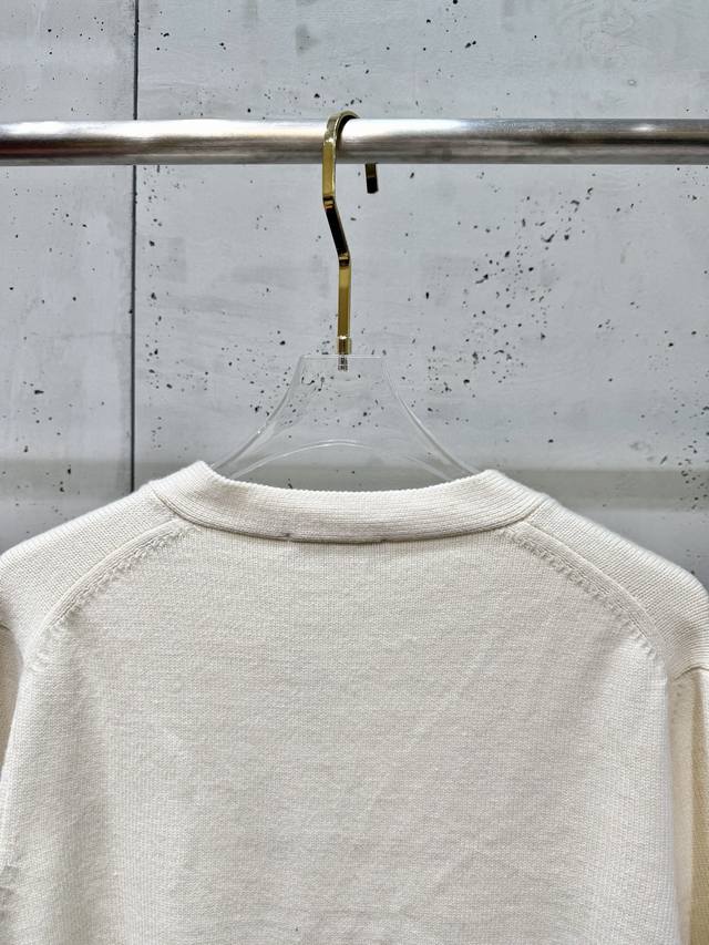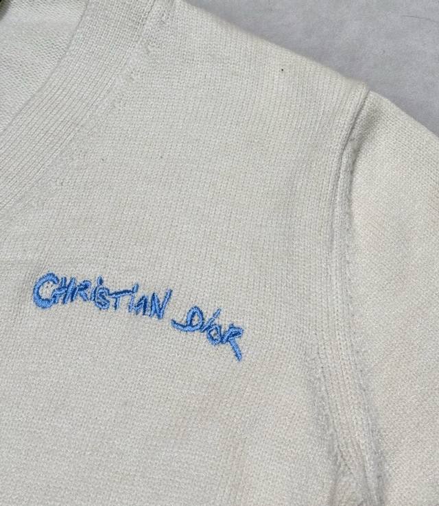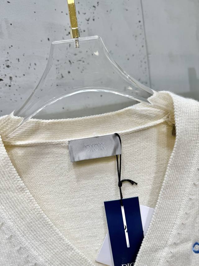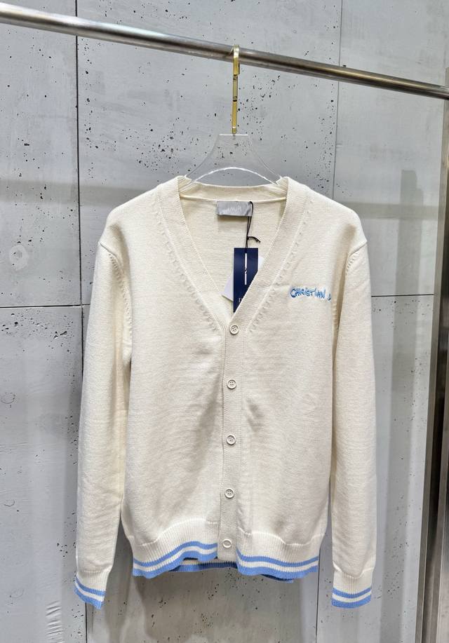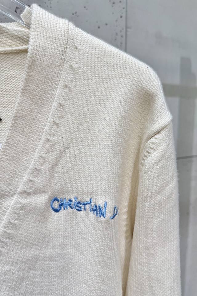 D25Fw Letter Embroidered Cardigan Sweater. Made with a 70% wool, 30% camel hair blend, 40-count double-ply yarn to prevent pilling. The yarn is custom-dyed in a beige color and knitted using an imported 12-needle knitting machine with a plain weave. The front is adorned with the classic logo, featuring letter patterns embroidered on an imported Tajima knitting machine with tens of thousands of stitches, using a precise, close-stitch technique. The embroidery is extremely fine and dense, with clear letter designs. It features double-sided fleece lining, fine workmanship, and a clear texture. The ultra-fine yarn is made from environmentally friendly fibers. Combined with a special soft wash process, the fabric has a soft touch. The bottom layer is made of environmentally friendly microfibers that are gentle on the skin and do not easily deform, maintaining their original crispness. It includes custom-made natural resin engraved buttons and complete accessories. Unisex. Sizes: Sml