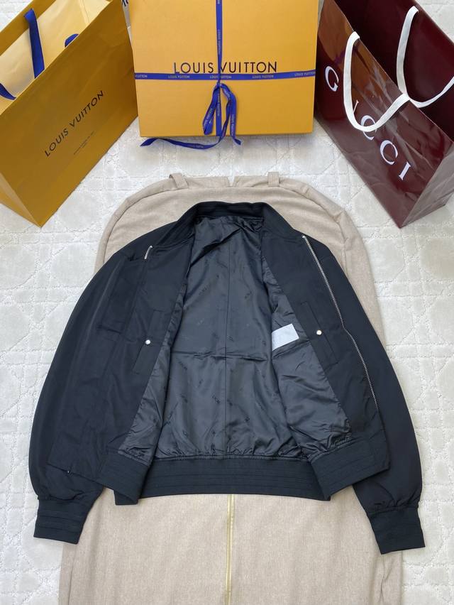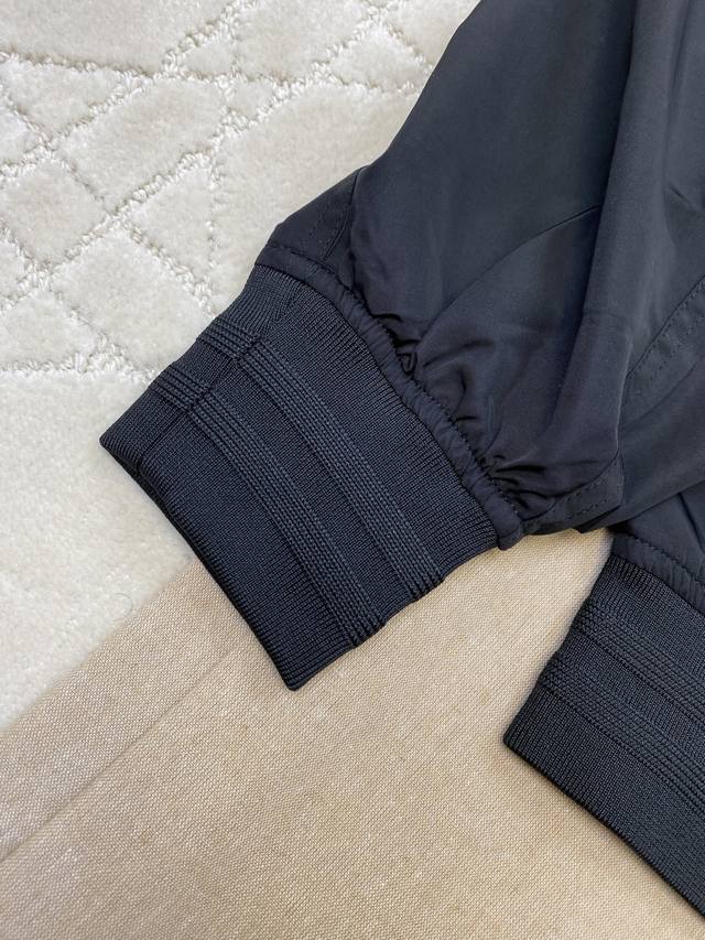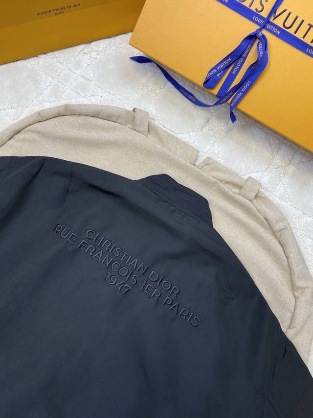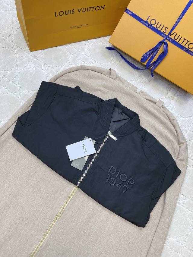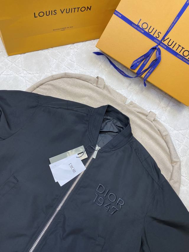 Dior 1947 Commemorative Flight Jacket. Made with 75% long-staple cotton and 25% spandex, the fabric is soft, comfortable, and smooth. The lining features a jacquard pattern. The logos on the chest, front, and back are embroidered with the brand's founding anniversary. The simple, mid-length cut looks great and achieves a sophisticated, youthful effect. Sizes: 46-52. Unisex. Color: Black.