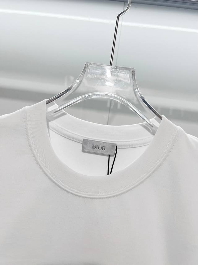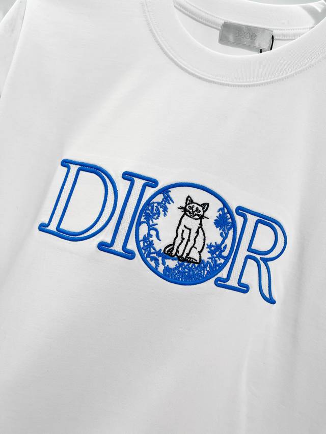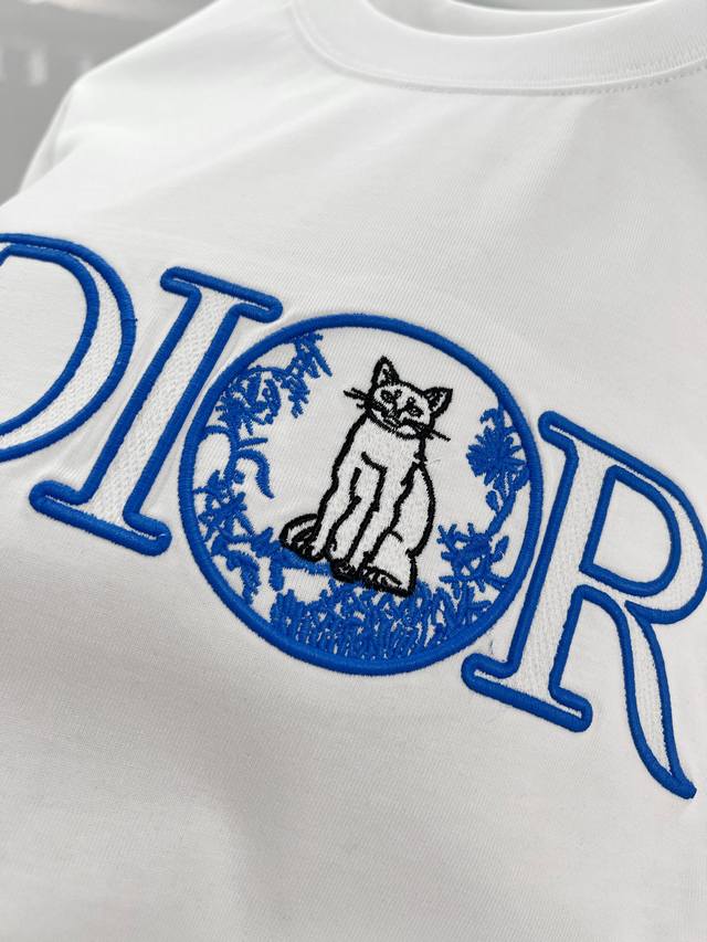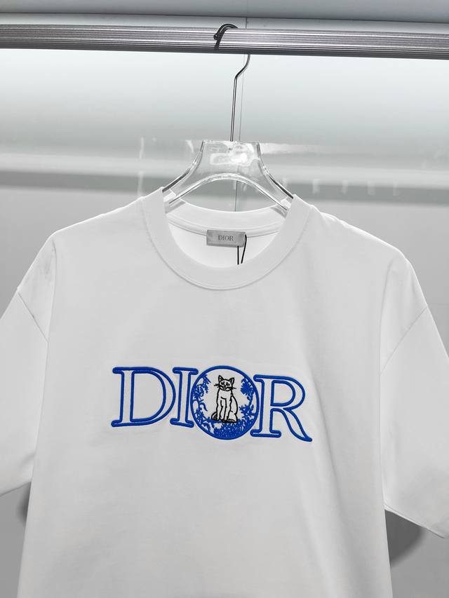 Dior 2026 New Arrival Official Website Synchronized Cat Embroidered Logo Unisex Short-Sleeve T-Shirt, Custom 320g 100% Double Yarn Pure Cotton Fabric, Custom Dyed 32-Count Double-Strand Ribbed Fabric, Complete with Neck Label, Hang Tag, and Main Label, Color: White, Sizes: S, M, L, XL