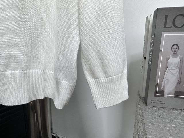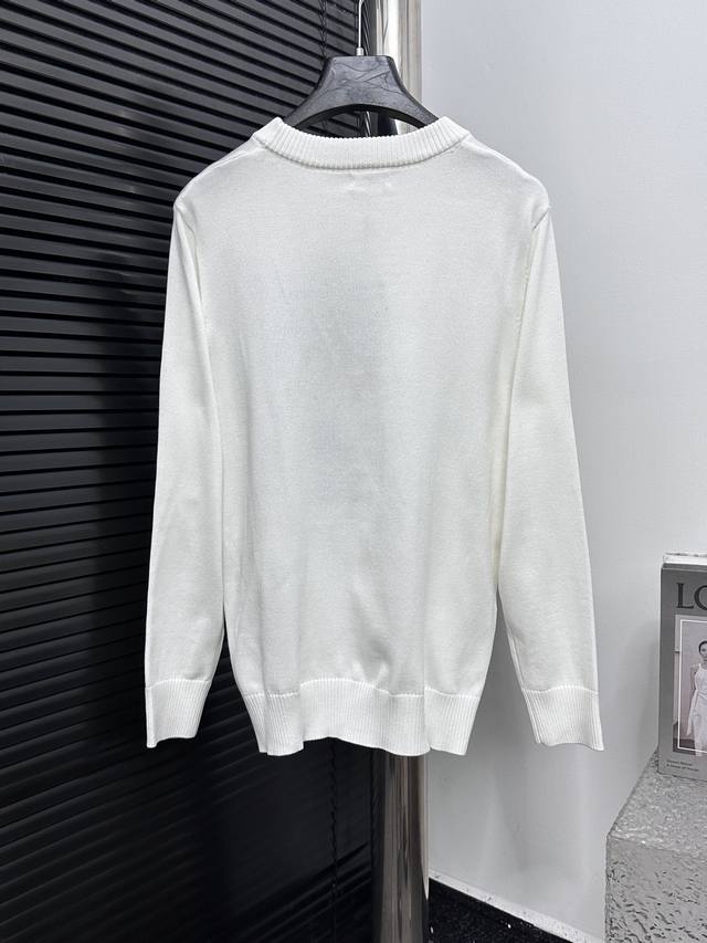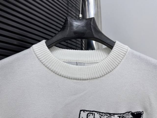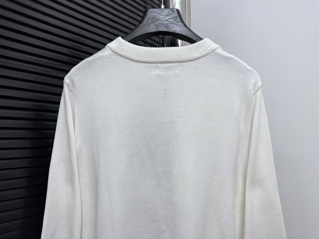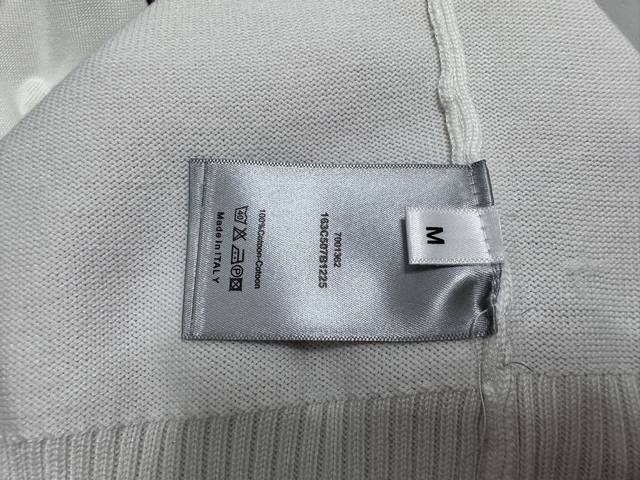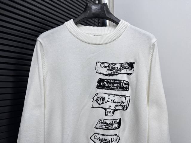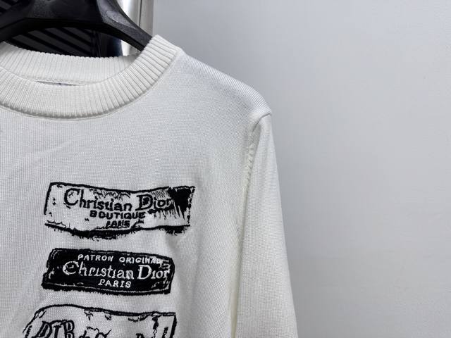 Dior 25Ss Archives Label Embroidered Crew Neck Knit Sweater. The Archives Labels logo is reinterpreted as an embroidered version of the brand's signature label. Crafted from white wool jersey, it features a ribbed crew neck, cuffs, and hem. Its timeless charm makes it perfect for adding a touch of elegance to spring looks. Features include embroidered Archives Labels on the chest, and a ribbed crew neck, cuffs, and hem. Sizes: S, M, L.