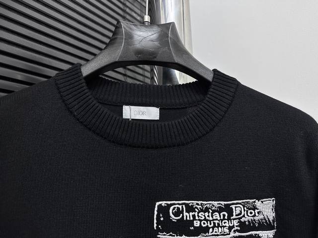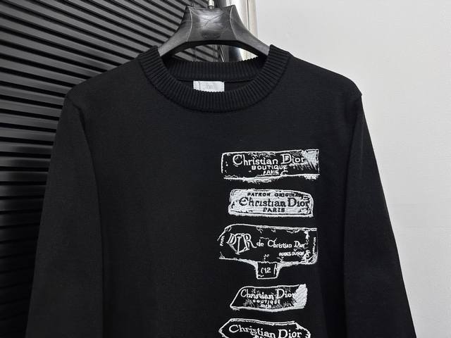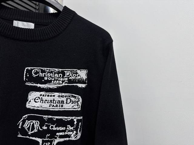 Dior 25Ss Archives Label Embroidered Crew Neck Knit Sweater. The Archives Labels logo is reinterpreted as an embroidered version of the brand's signature label. Crafted from white wool jersey, it features a ribbed crew neck, cuffs, and hem. It exudes timeless charm and is perfect for adding a touch of elegance to spring looks. Features include embroidered Archives Labels on the chest, and a ribbed crew neck, cuffs, and hem. Sizes: S, M, L.