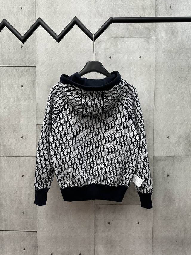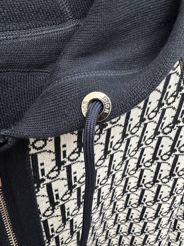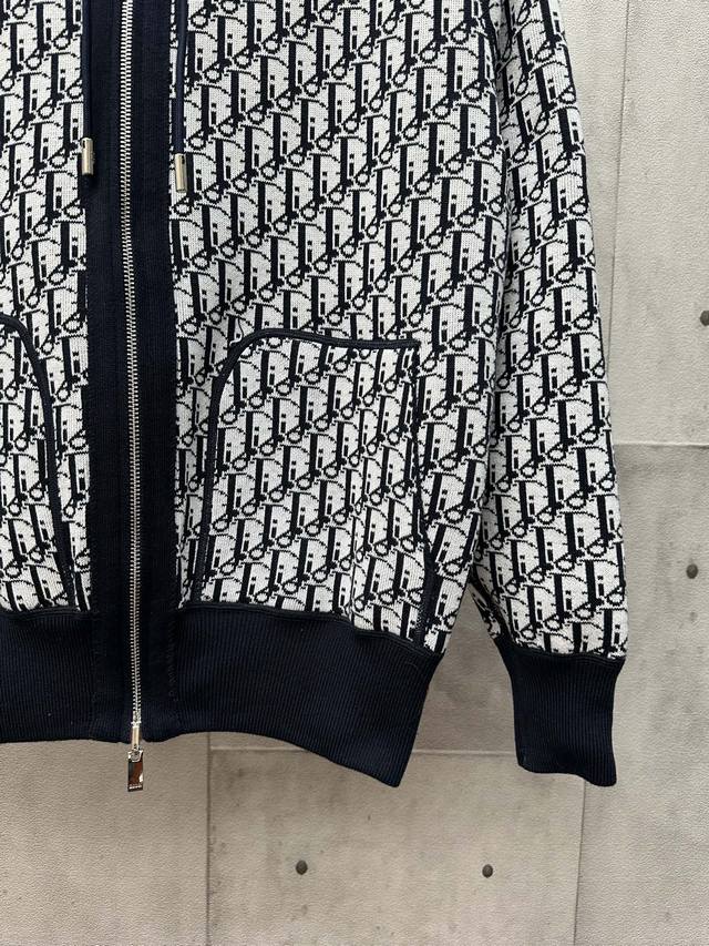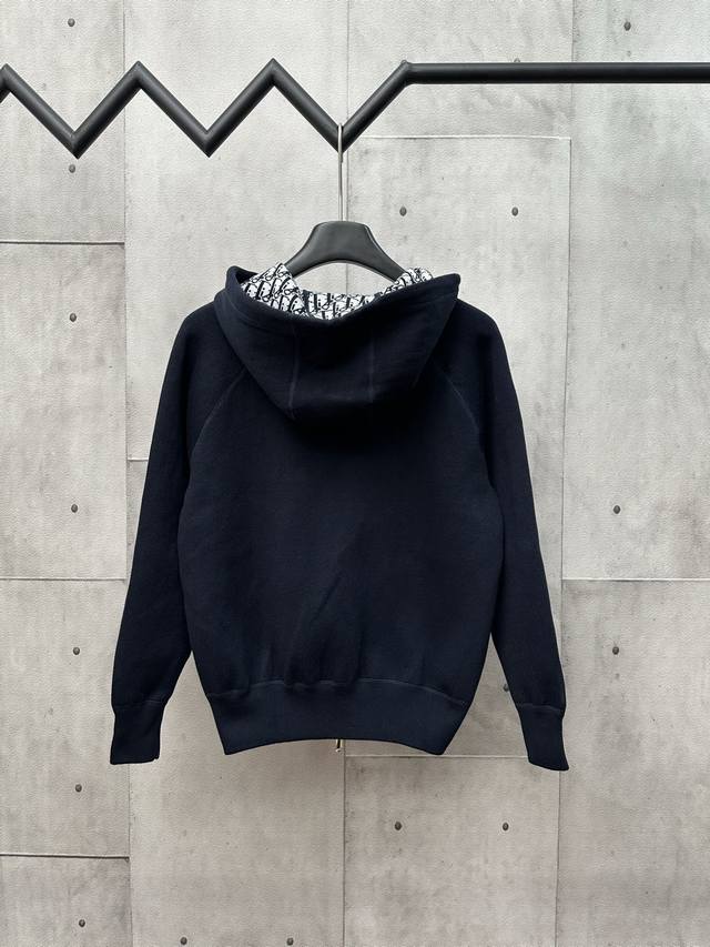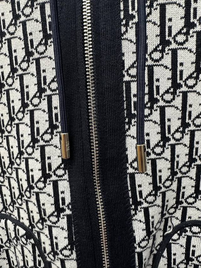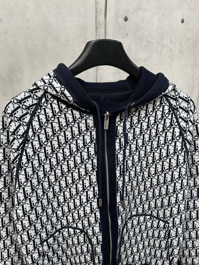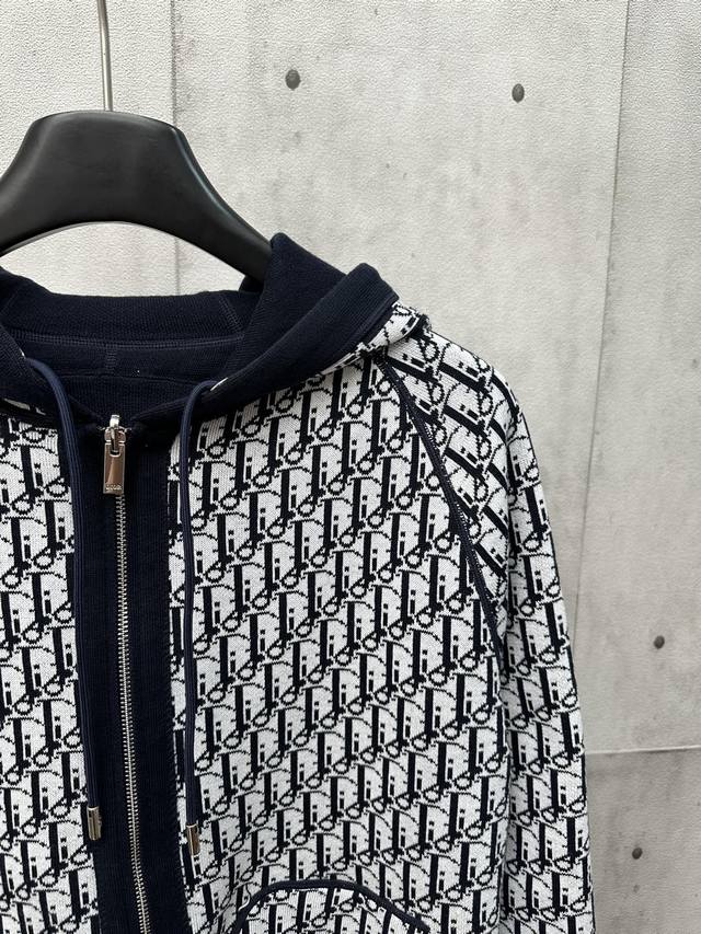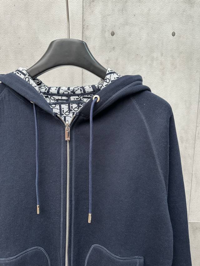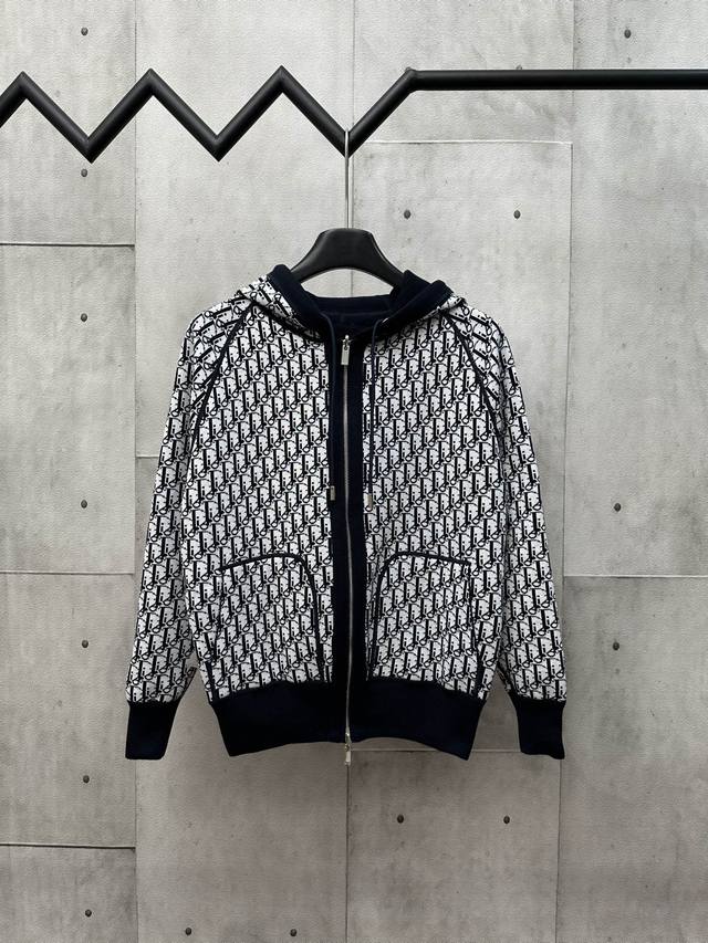 Dior 25Ss Hooded Cardigan, Reversible Zipper Knit Cardigan. Made of cashmere fabric, containing 50% wool and pure cotton, with matching lining and jacquard lettering. One side features a solid color logo, while the other side displays the classic monogram. Reversible for easy style changes. Custom-made imported velvet, machine-knitted, high-quality materials for a luxurious feel. Comfortable and skin-friendly. Made with top-notch factory workmanship, perfect details and texture. Sizes: S, M, L, XL.
