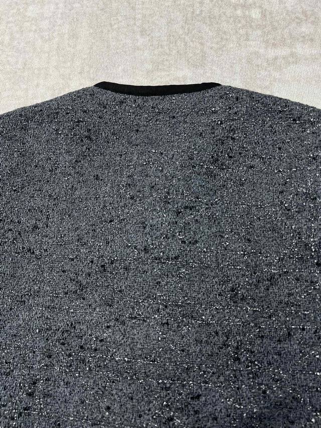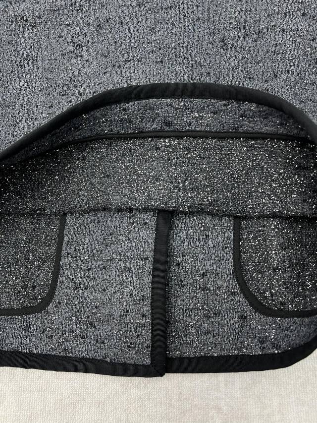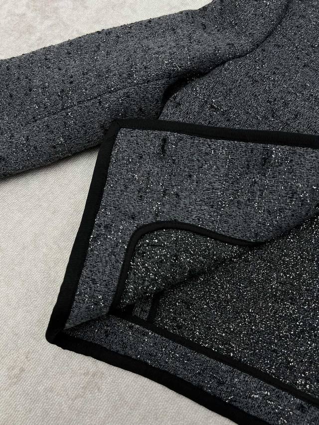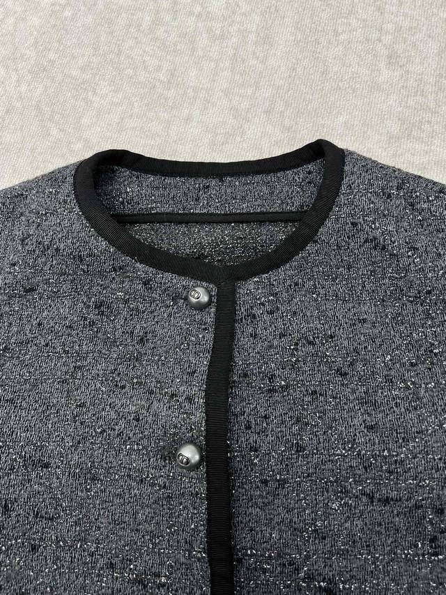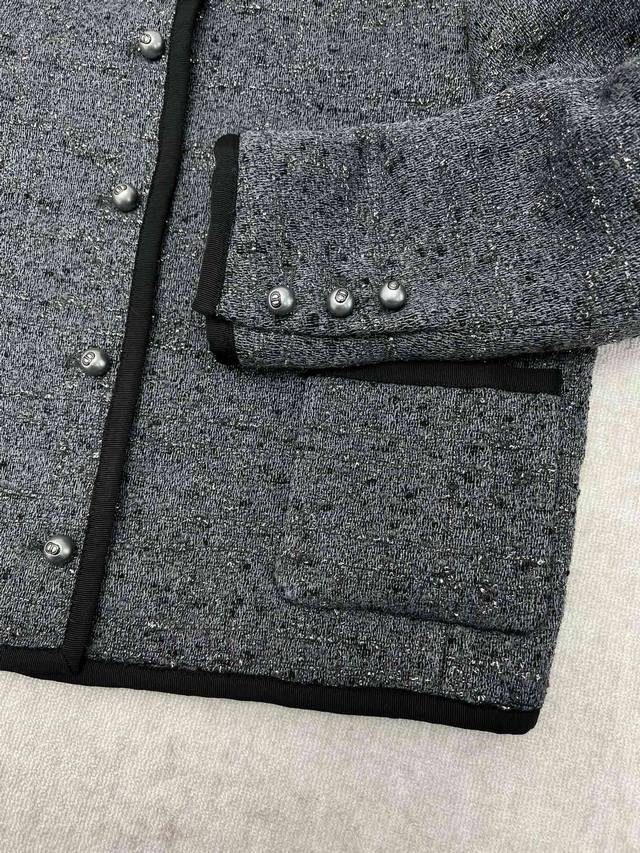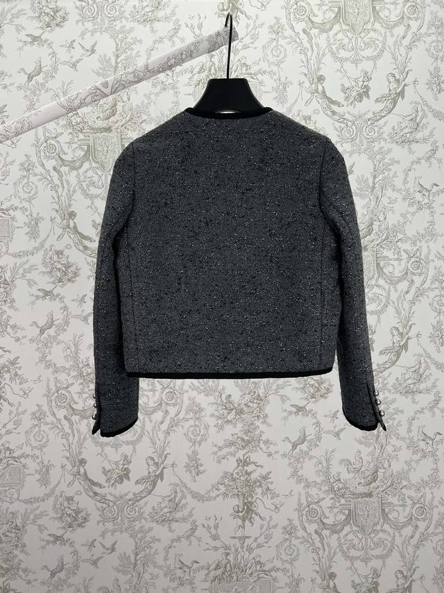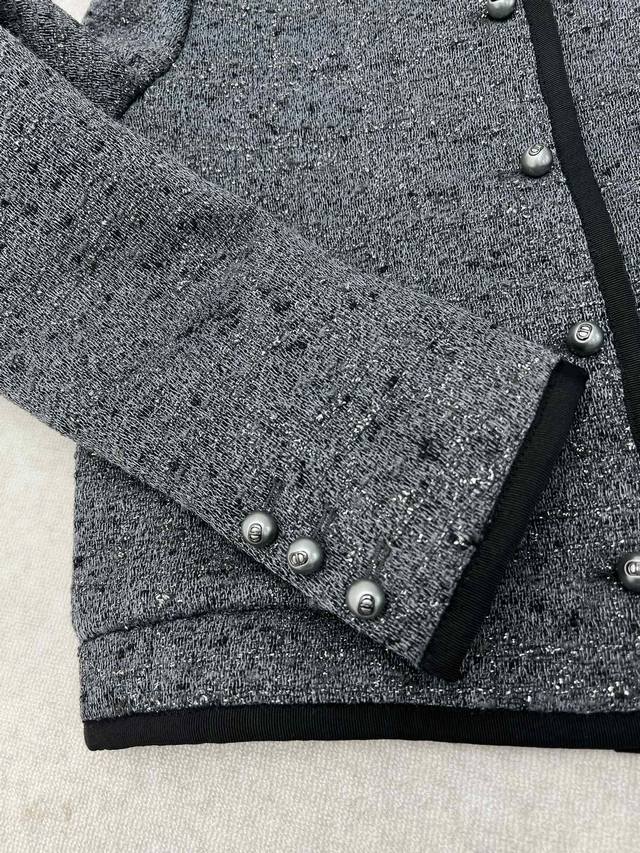 Dior 25Ss New Short Jacket (Ddd) Grey cotton-blend tweed with silver metallic thread oversized cannage. This short jacket exudes elegance and modern style. Crafted from grey cotton-blend tweed, it features an oversized cannage pattern embroidered with silver metallic thread. The short, regular fit is accented with Dior Tribales buttons, highlighting the Cd resin beads inspired by classic Dior earrings. It includes patch pockets and black grosgrain details, and can be paired with other oversized cannage pieces for a sophisticated classic look. (Ddd Sizes: S, M, L)