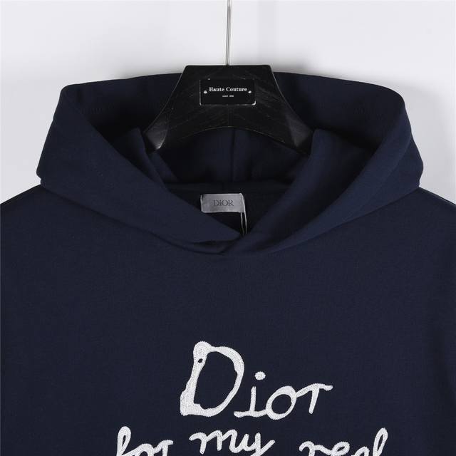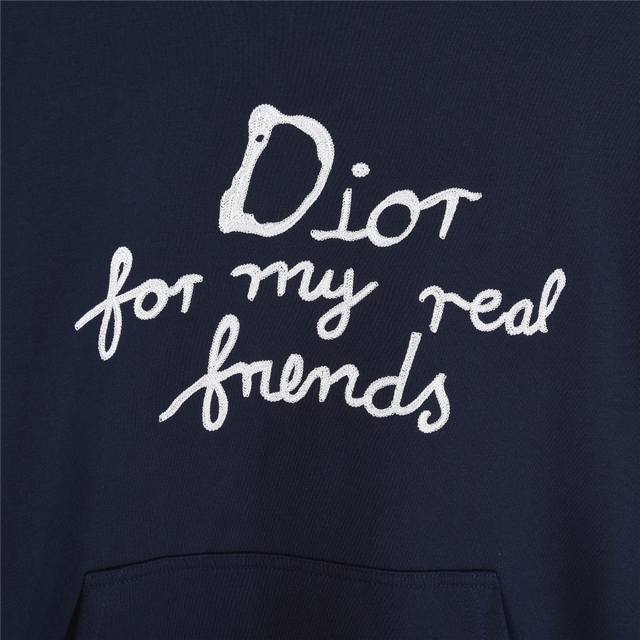 Dior and Hylton Nel Collaboration Slogan Embroidered Hoodie This hoodie showcases the Dior For My Real Friends logo from the Dior And Hylton Nel collaboration. Crafted from navy blue cotton fleece, it features contrasting embroidery on the front and a practical kangaroo pocket. The relaxed fit, with ribbed hem and cuffs, makes it easy to pair with various casual outfits. Dior And Hylton Nel Collaboration Doir For My Real Friends Logo Embroidery Hooded Hoodie with Kangaroo Pocket on Front Ribbed Hem and Cuffs 100% Cotton Colors: White, Blue Size: S-XL