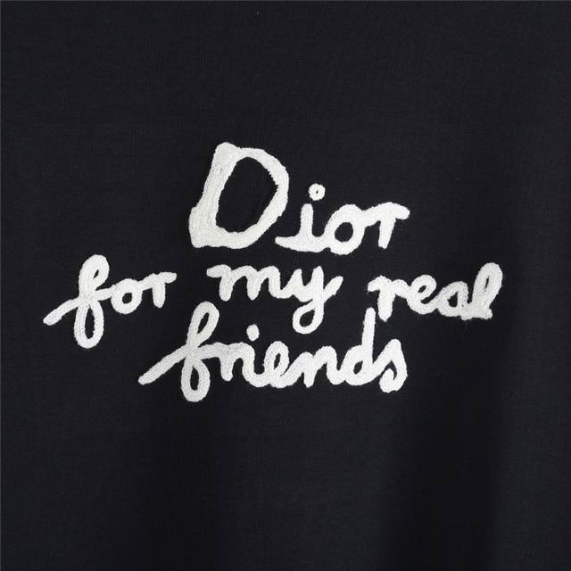 Dior and Hylton Nel Collaboration Slogan Embroidered Long-Sleeve T-Shirt. Custom-woven, dyed, washed, smooth long-staple cotton, 310g/m?, latest boutique style. This long-sleeve T-shirt showcases the Dior For My Real Friends logo from the Dior and Hylton Nel collaboration. Crafted from white cotton jersey, it features a classic silhouette with a ribbed crew neck. Embroidery adorns the chest for added style. The casual cut pairs well with sweatpants or jeans. Features include: Dior and Hylton Nel collaboration, Dior For My Real Friends logo embroidery, ribbed crew neck, sleeves, and hem, 100% cotton, colors: black, white, size: M-XXL.