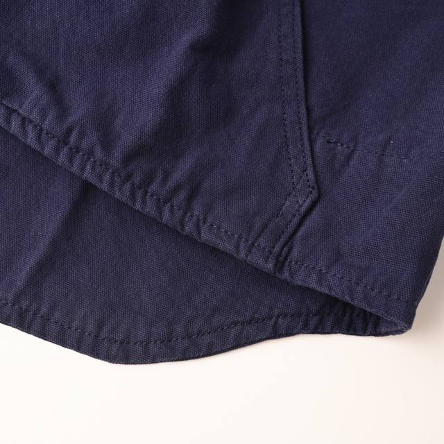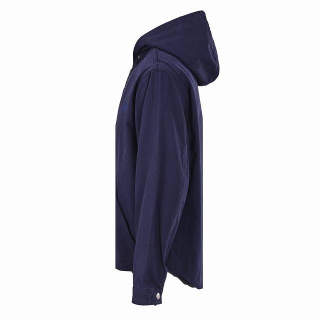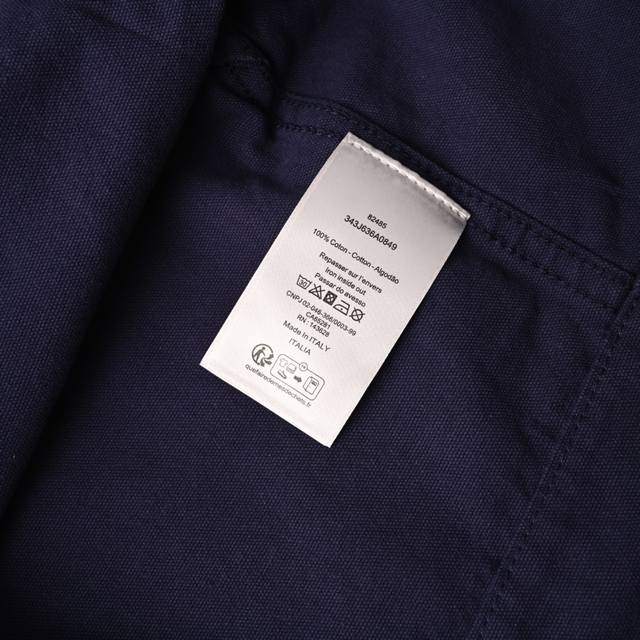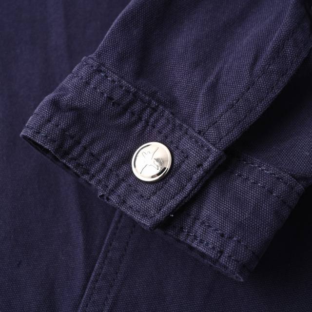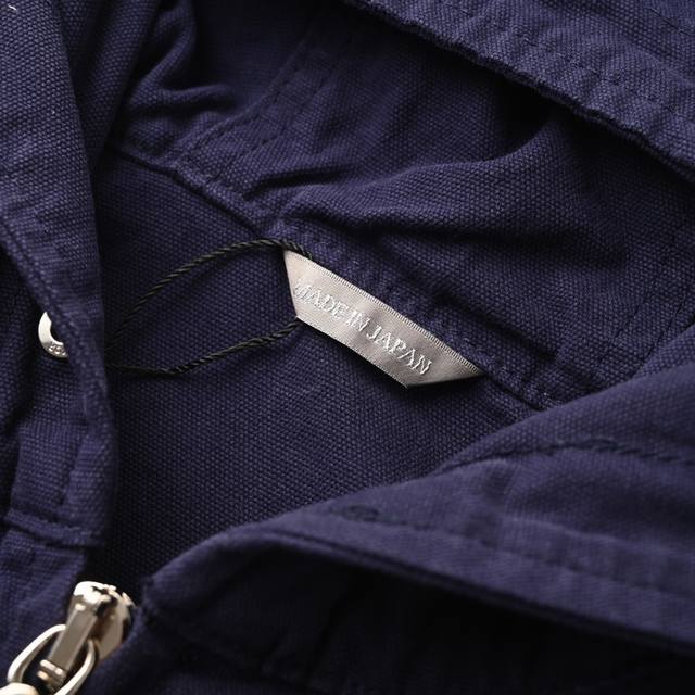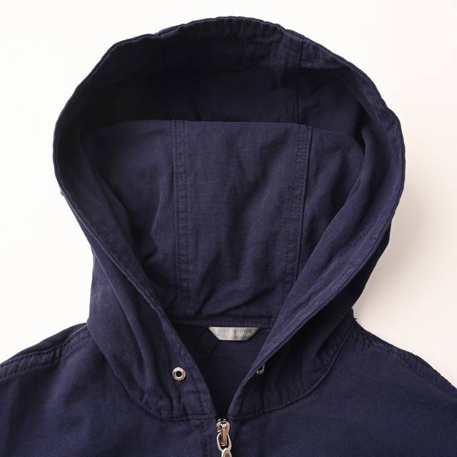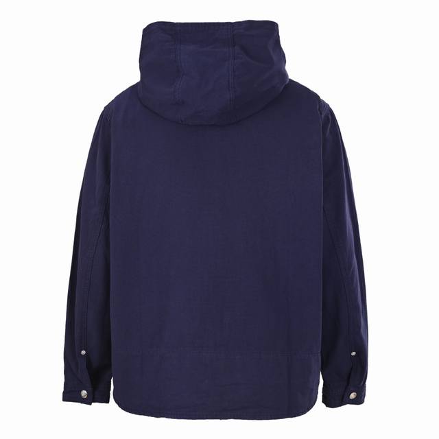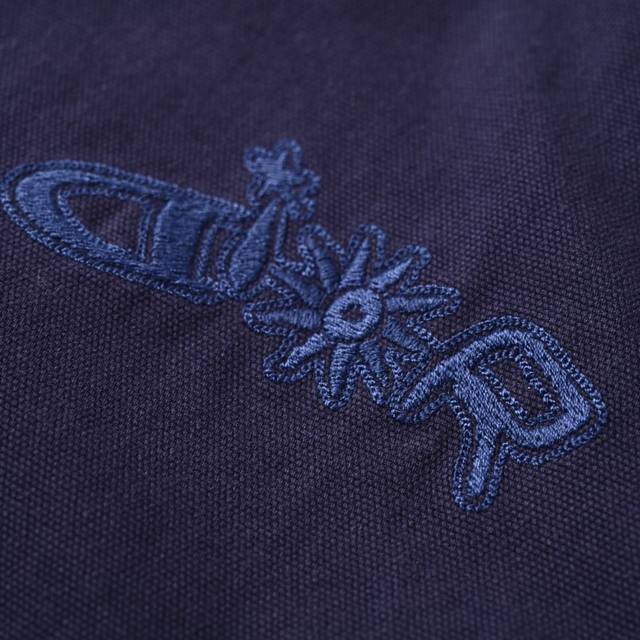 ) Custom-dyed grey-blue traditional densely woven thick cotton, imported machine embroidery technology achieves high precision, smooth and delicate lines, ergonomic three-dimensional tailoring. The workmanship is complex, tedious, slow, and has high waste. Electrolytic deep blue stone abrasive washing process, which first uses electrochemical reaction to change the fabric color, then mixes the fabric with abrasive in a grinding machine, and uses hot water to achieve a specific washing effect. Custom accessories, loose fit (