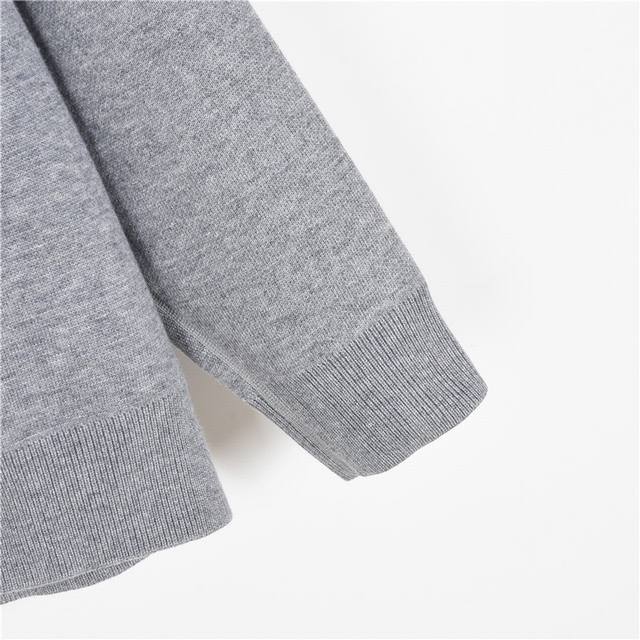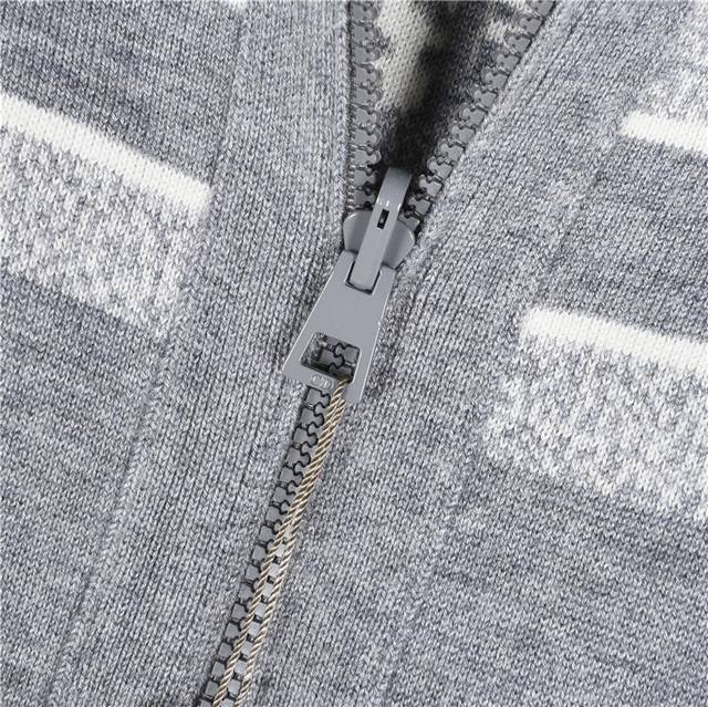 . Made from imported cashmere yarn. New for early fall. Dropped shoulders. Premium navy blue monogram logo zipper. Reversible cashmere jacket with jacquard weave on the back. Luxurious and stylish hooded design. Fashionable and sophisticated. Classic fit. Flattering and highly recommended. Color: Navy Grey. Sizes: S-Xl.