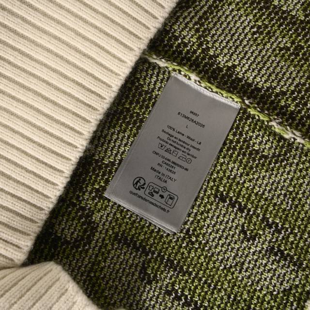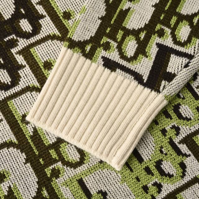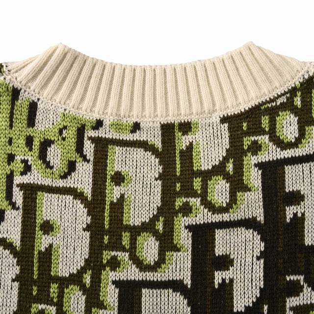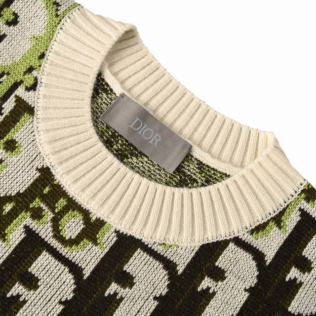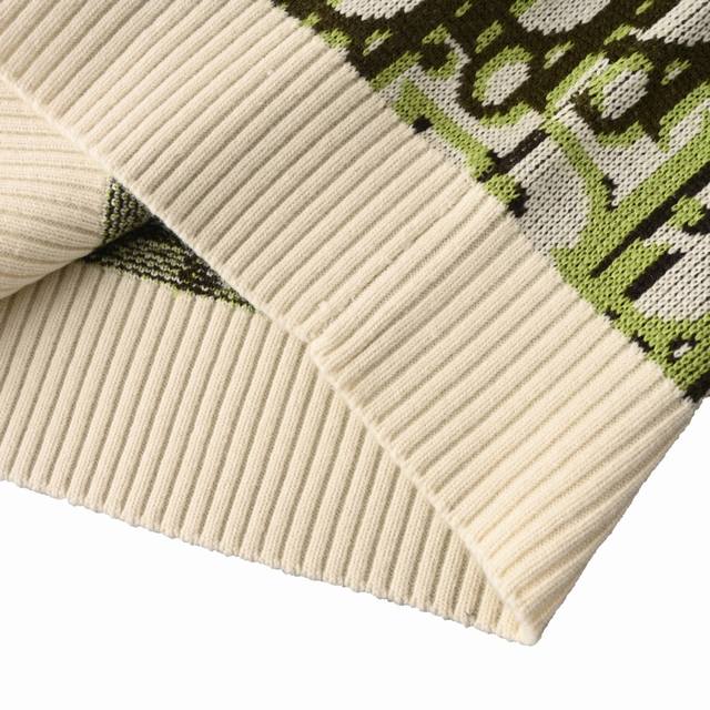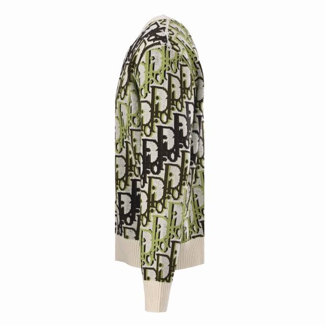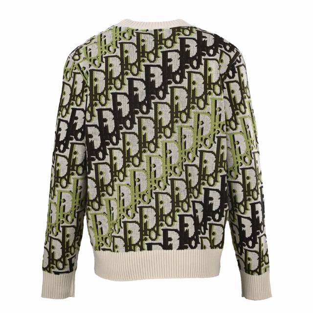 Dior Dior Oblique Monogram Jacquard Crew Neck Knit Sweater. Pattern and Color Scheme: The entire sweater is adorned with Dior's classic Oblique monogram jacquard, presented in a striking color combination of fluorescent green, black, and off-white. Fit and Cut: Relaxed and casual cut, crew neck design, ribbed collar, cuffs, and hem, fitting the body while maintaining a relaxed feel. Material: Made in Italy from a high-quality wool-blend knit fabric with cashmere content, medium thickness, combining warmth and texture. Brand Logo: The monogram pattern itself is a signature Dior design; some versions feature a Christian Dior ribbon logo on the back. #All knitwear and sweaters are not recommended for machine washing or high-temperature tumble drying! Size: S-XL