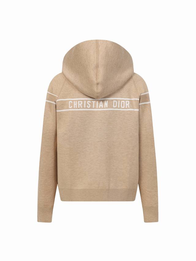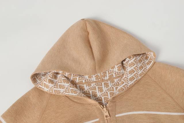 Dior Double-Sided Jacquard Cashmere Knit Hooded Hoodie in Brown (Original Price 22,337). Developed from a cashmere blend knit fabric, this hooded hoodie features a soft and comfortable feel. It has a zip closure on the front and delicate ribbed trim on the cuffs and hem. Reversible, one side is a solid blue, while the other features the brand's iconic Oblique pattern, and the back is adorned with Cistian ribbon details. The unlined cut ensures lightweight comfort, while the fitted silhouette showcases an elegant figure. The craftsmanship is exquisite, with the double-sided knit technology allowing for reversible wear, and the ribbed trim enhancing the three-dimensional effect. Dry cleaning is recommended to maintain the delicate texture of the cashmere fabric. This piece combines casual and fashionable styles, easily matching various outfits and showcasing the brand's exquisite craftsmanship and classic aesthetics. Colors: Navy, Light Grey, Brown. Sizes: S, M, L.