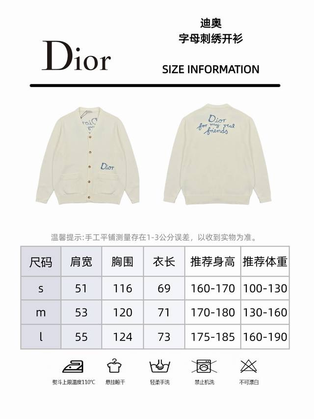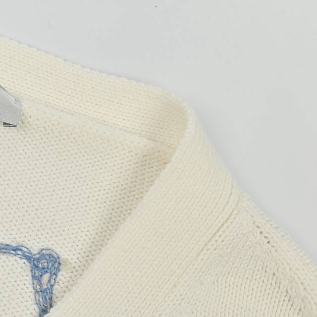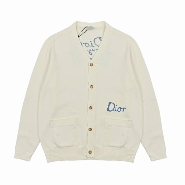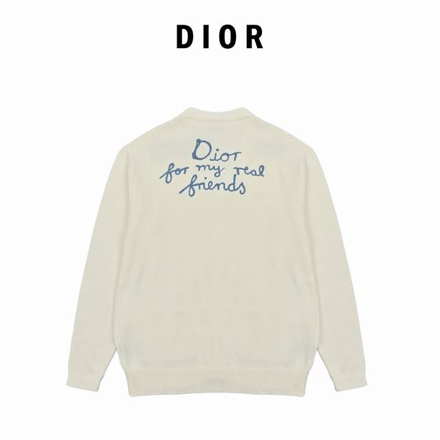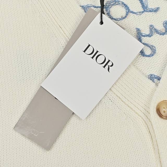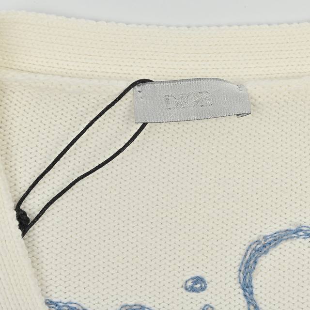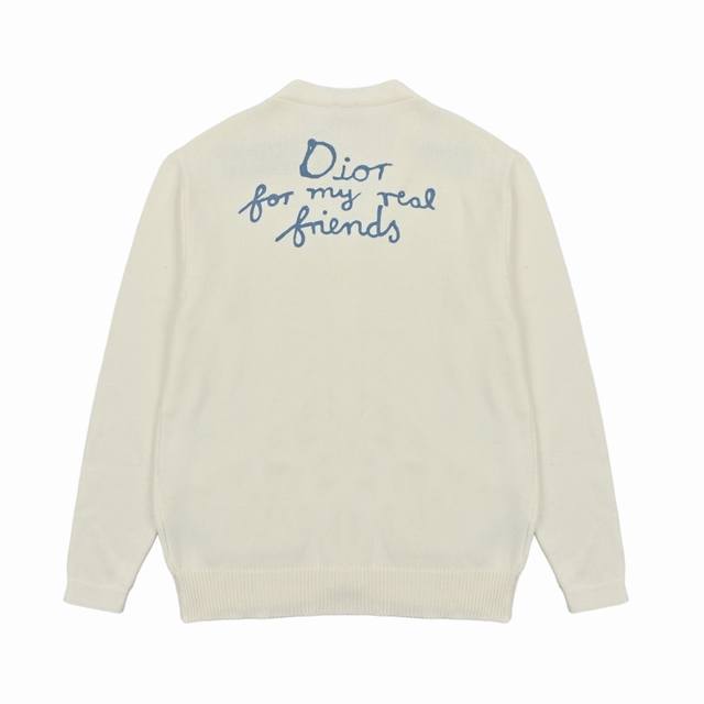 Dior Embroidered Cardigan Ddd Dior Embroidered Cotton Blend Button-Down Cardigan Ddd The fabric is made of 40-count cotton yarn, with 62% cotton and 38% nylon. The blend of the two wools effectively creates a more three-dimensional look. The embroidery uses a high-density wool yarn embroidery technique, with the collaboration logo embroidered on the front. Approximately 12,000 stitches. The buttons are made of natural horn and feature the brand's iconic Dior] logo. This cardigan showcases the Dior For My Real Friends logo from the Dior And Hylton Nel collaboration. It is crafted from a white cotton blend jersey fabric, embroidered on the front and back, with button closure and ribbed trim. Ddd 003 Size SL DDD