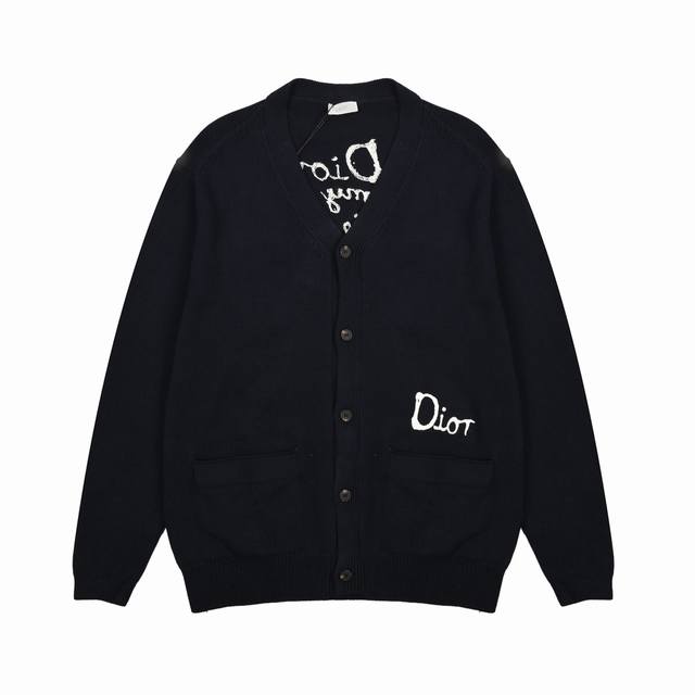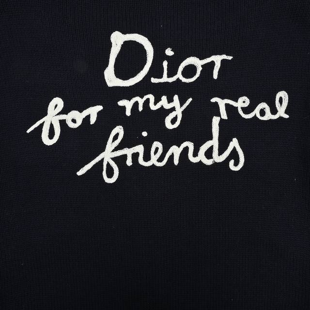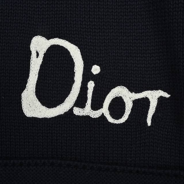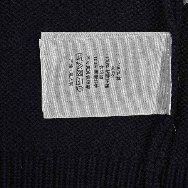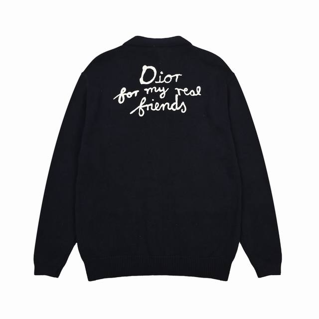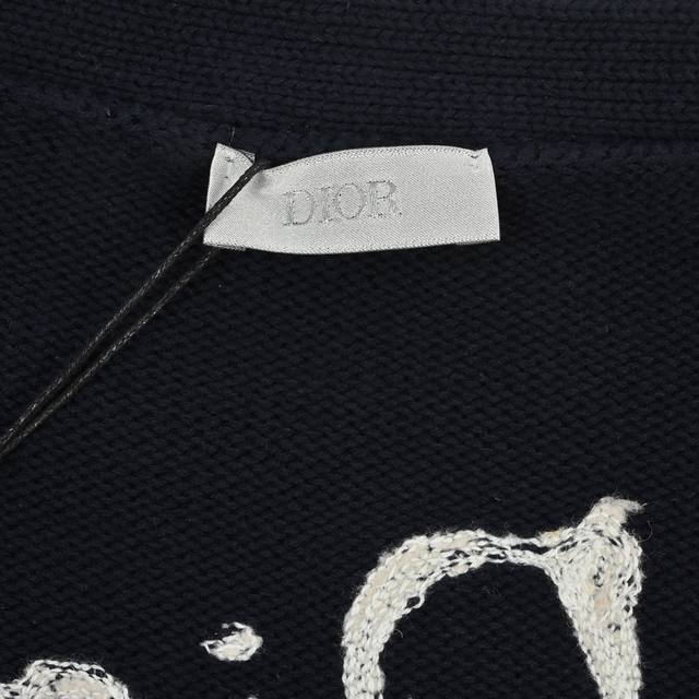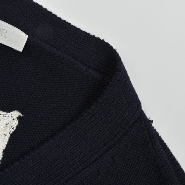The fabric is made of 40s cotton yarn wool cotton with a cotton content of 62%. It is mixed with 38% nylon. The blend of the two wool materials can effectively make the upper body effect more three-dimensional. The embroidery uses a high-density embroidery technique with wool yarn, and the front numbers are all embroidered with the joint series logo. The number of stitches is approximately 12,000. The auxiliary buttons are made of natural horn buttons with the brand's iconic Dior] logo on the buttons. This cardigan displays the Dior For My Real Friends logo from the Dior And Hylton Nel joint series. It is carefully crafted from white cotton blend jersey fabric, decorated with embroidery on the front and back, with button closures and ribbed trims.