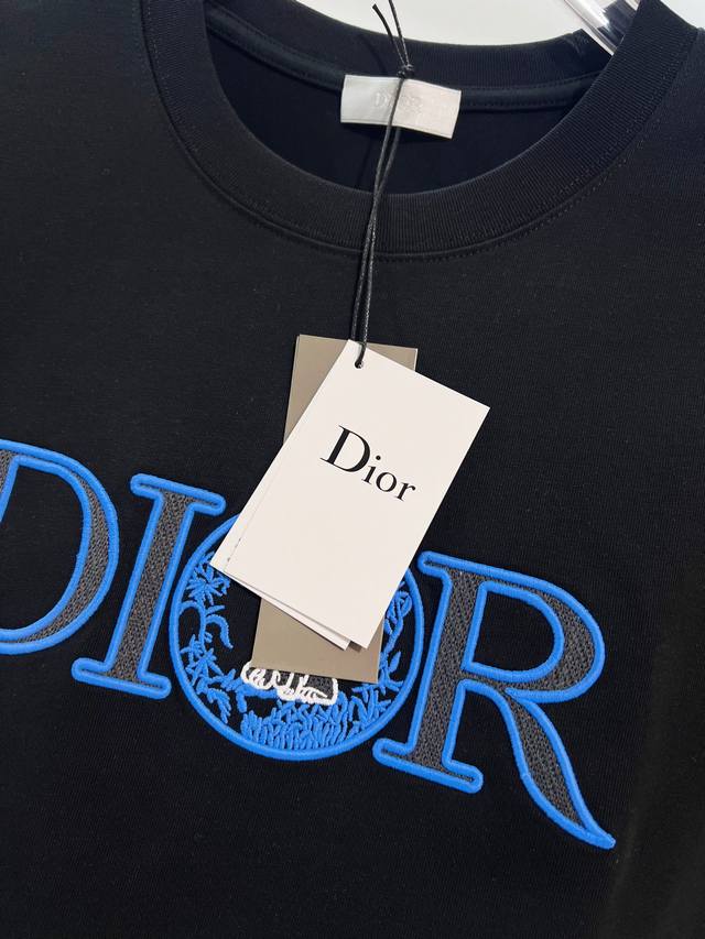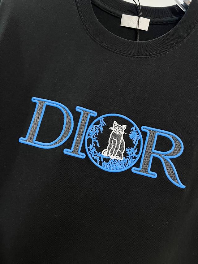 Dior High-Quality 320g Crew Neck Short Sleeve T-Shirt, Classic Blue Embroidered Logo Kitten, 2025Ss Official High-Quality Version, Stylish, Versatile, Trendy, Original Quality Fabric, Complete with Hangtag, Neck Label, Washing Label, and Three Tags, Colors: Black, White, Sizes: S, M, L, XL