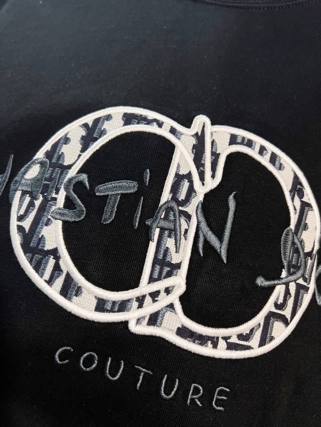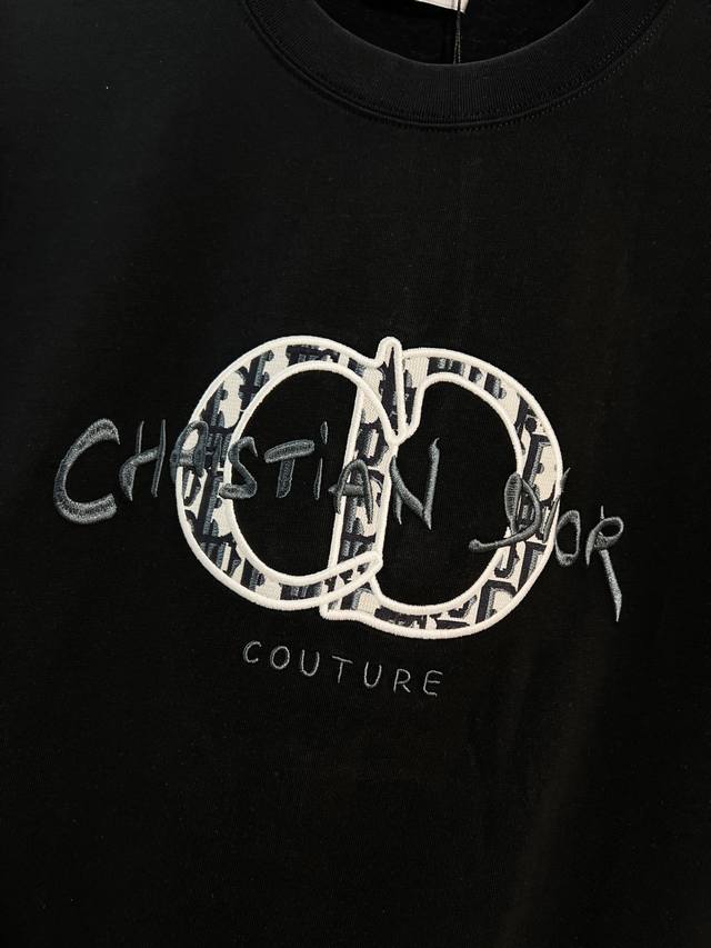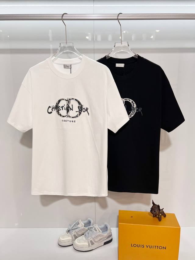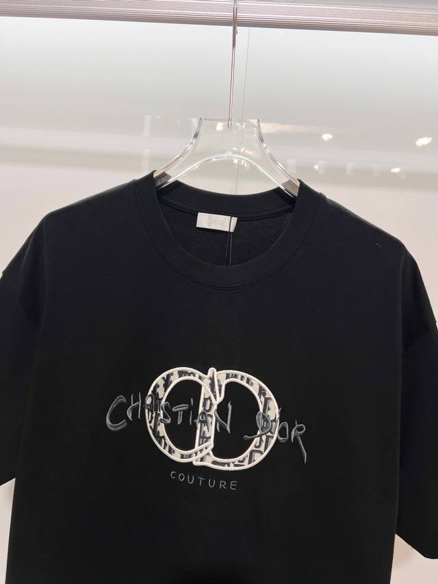 Dior High-Quality 320g Crew Neck Short Sleeve T-Shirt. Features the brand's classic Cd color-blocked embroidered slogan and logo on the chest. Officially synchronized with the 2025 SS collection. High-quality, fashionable, versatile, and trendy. Made with original quality fabric. Includes hangtags, neck labels, and wash labels. Colors: Black, White. Sizes: S, M, L, XL.