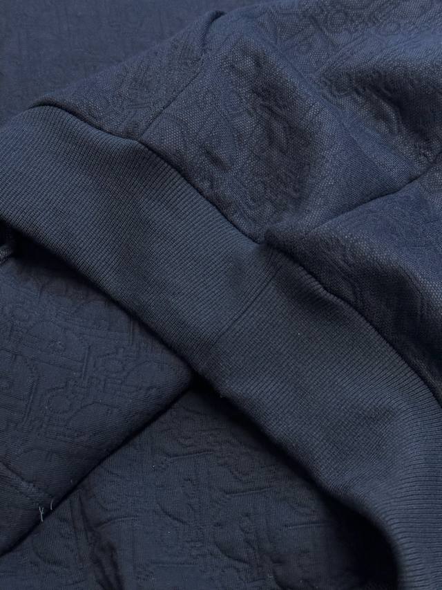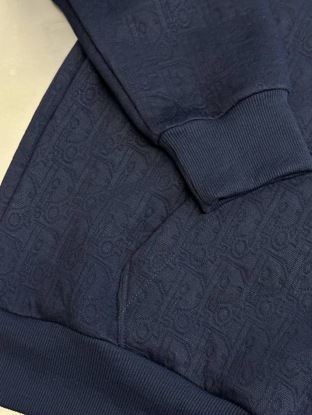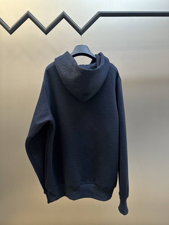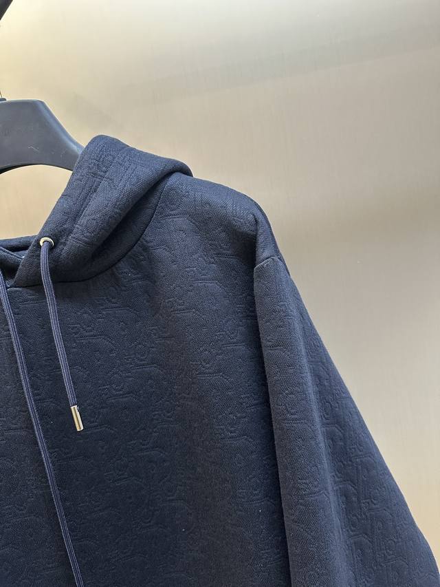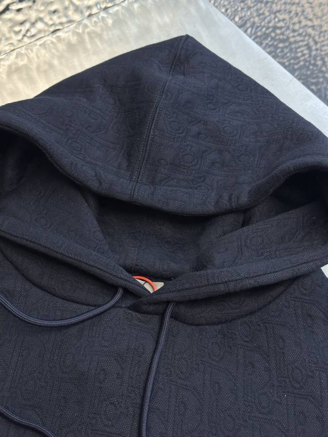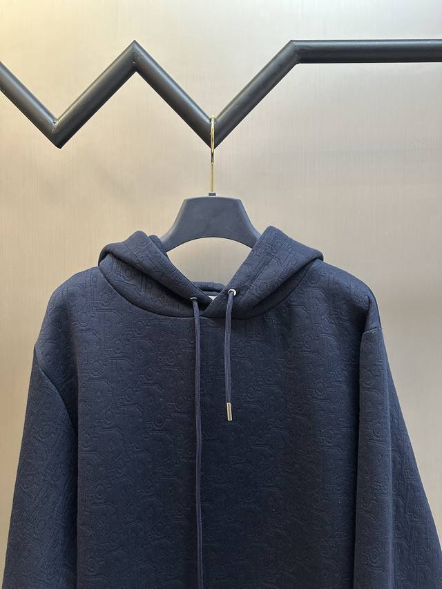Dior Oblique All-over Letter Hooded Sweatshirt (DDD). Made with custom-woven Dior Oblique jacquard cotton, this sweatshirt is adorned throughout with subtle Dior Oblique jacquard patterns in the same tone, representing the ultimate expression of the brand's iconic symbolism. The DDD jacquard fabric technique uses a full-width Dior Oblique jacquard weave to the fabric surface, precisely controlling the interlacing density and tension of the yarns to create a more three-dimensional effect. The DDD infrared positioning cutting bed uses infrared emitters and receivers to achieve precise material positioning with micron-level accuracy, ensuring high-precision cutting and alignment. DDD Size: S, M, L, XL.