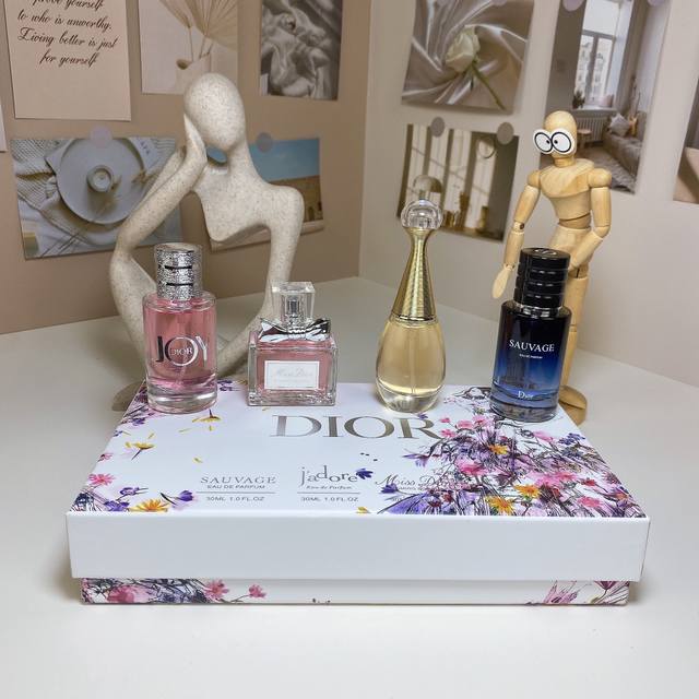 This 4-Piece Set of Dior Perfume with Colorful Flowers contains: J'adore + Floral Sweetheart + Wilderness Men + Joy Perfume. This exquisitely crafted perfume gift set includes one 30ml bottle with a spray nozzle, conveniently satisfying all your Dior perfume desires at once, giving you the most captivating fragrance.
